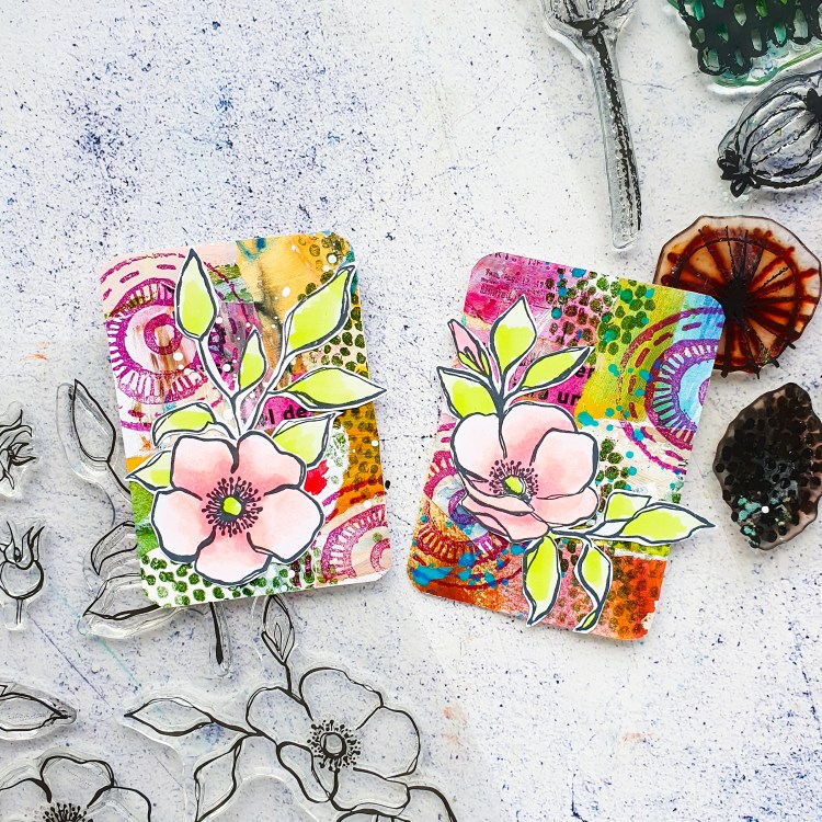 Hier habe ich ganz einfache ATCs mit einem Hintergrund aus Papierresten. Auf dem Hintergrund habe ich noch ein bisschen mit dem Pencil Marks 5 Set gestempelt. Das Hauptmotiv ist aus dem Inky Flowers Stempelset und wurde mit Alkoholmarkern koloriert. Gestempelt habe ich auf Perfect Coloring Paper.