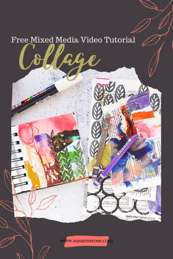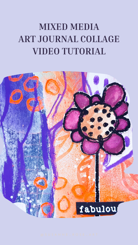 I’m creating two spreads today in my mini collage art journal. I often do this when I want to get rid of my left over collage scraps. I am glueing the papers down intuitively and add different mark makings on top with stamps, crayons and posca markers. If you want to see how I make my collage papers I have the playlist with all the videos linked underneath.
