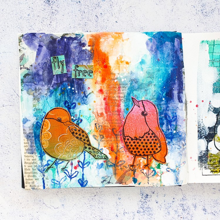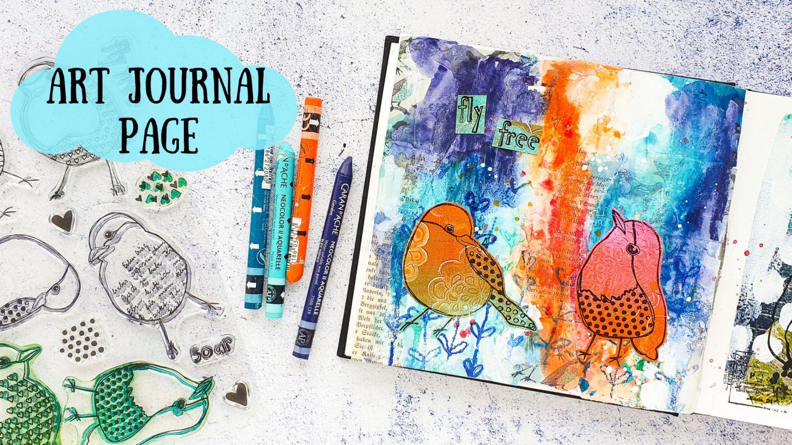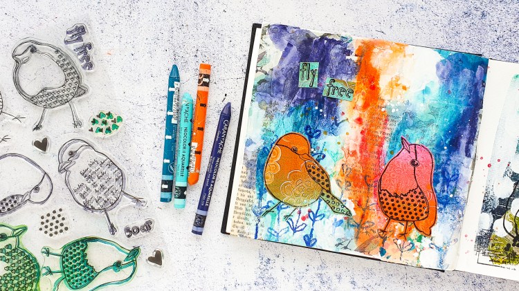 Das heutige Video dreht sich wie immer um Mixed Media. Ich gestalte eine Seite im Art Journal mit einem Collage-Hintergrund, Neocolor II Kreiden und einigen Stempeln. Alle Stempel findest du in unserem Shop. Als Hauptmotiv verwende ich zwei Vogelmotive aus unserem Textured Birds Stempelset, die ich auf einen Geldruck stempele. Im post findest du den Link zum deutschen Video und auch einige Fotos von der fertigen Seite.