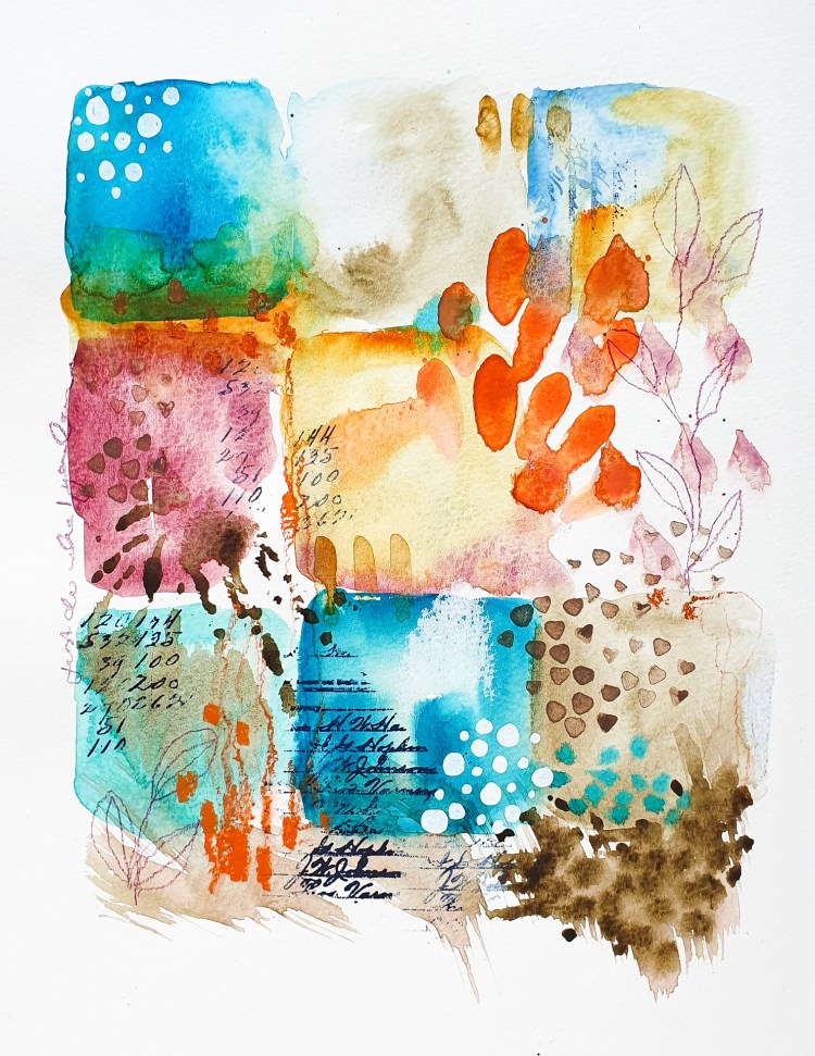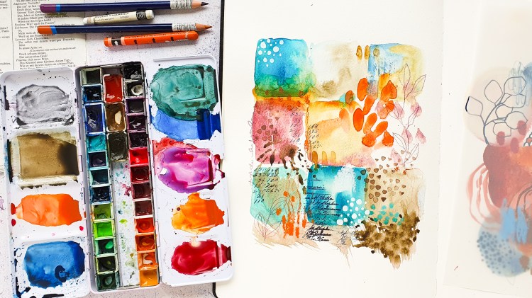 In today’s process video I am creating an intuitive and relaxing spread in my Moleskin watercolor art journal. I really love these kind of making art to calm down, relax and get my creative juices flowing. The process is purely intuitive and without any pressure. I explore markmaking, mixed media techniques and color palettes while creating the page. I also used a few stamps to add more interest. Click on more to watch the process video.