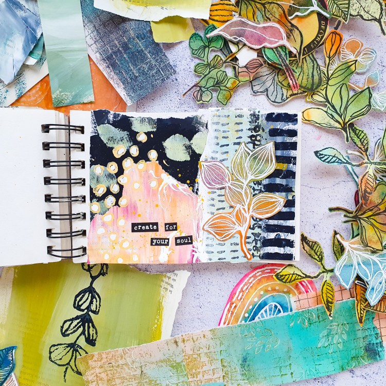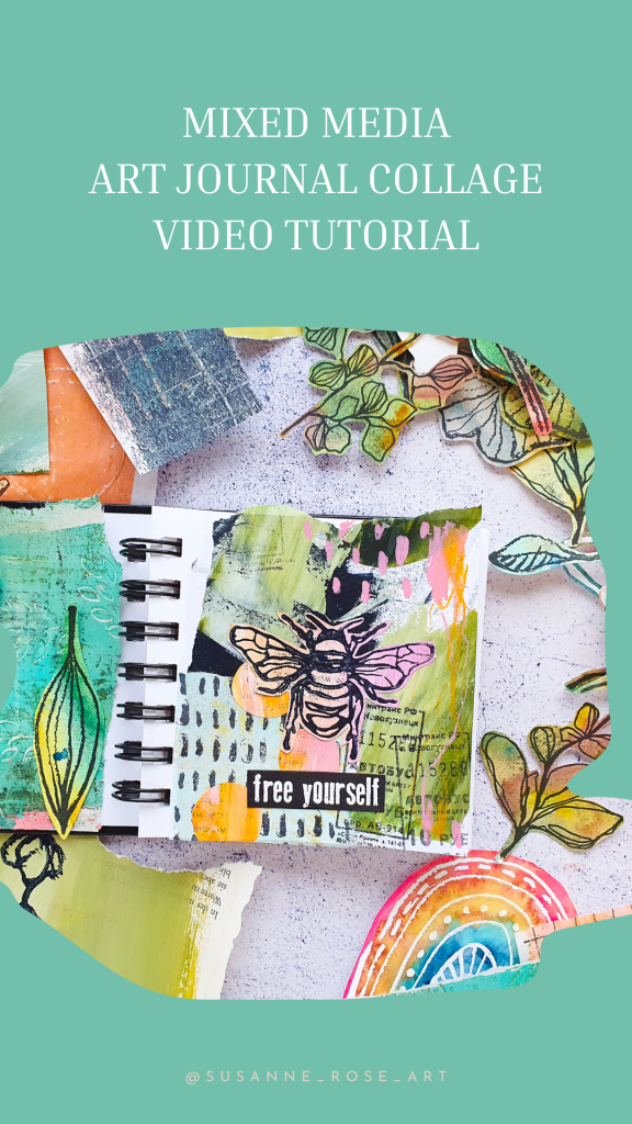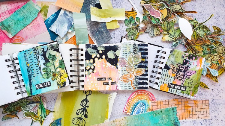 In today’s video I am creating three spreads in my mini art journals from left over papers. Last weekend I took a class from Laura Horn and made a bunch of collages and now I wanted to get rid of all these paper scraps. The journals I am working in are super cheap sketchbooks. The bigger one is from the Action store, the smaller one is from Gerstaecker. As main images I am using stamps from Sketchy Leaves and Inks Friends.