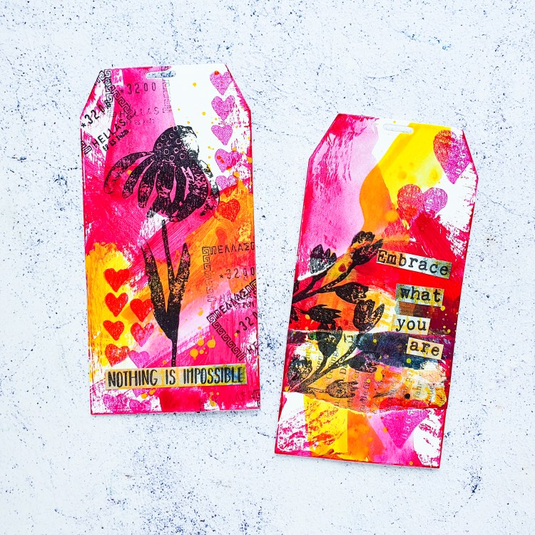 Hi there! I have to share some mixed media tags and some quick how-to videos today. I used hand-painted collage paper, acrylics and stamps from Rubber Dance.