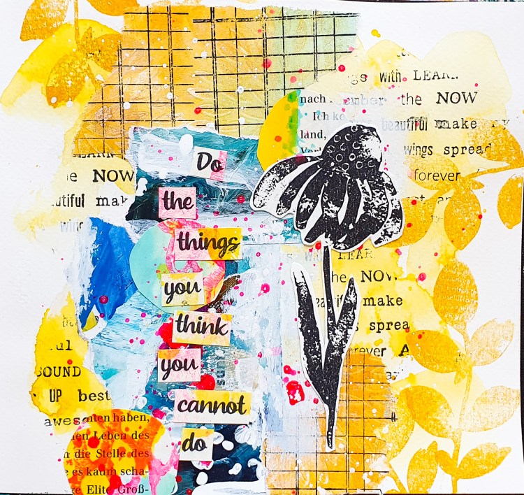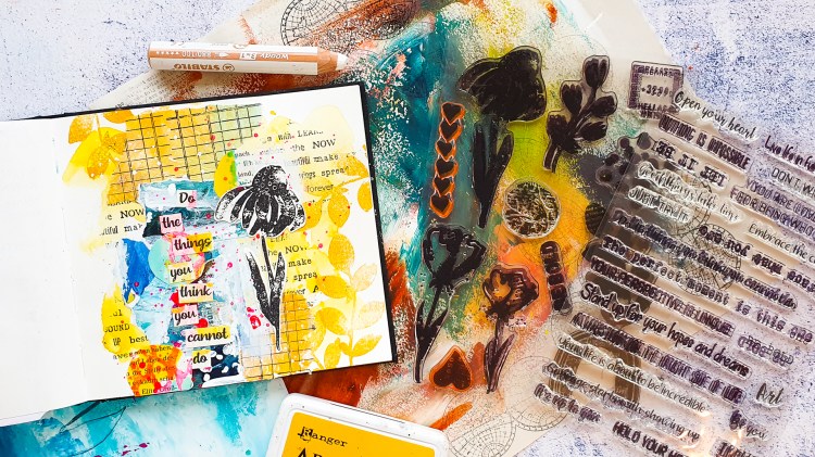 Im heutigen Video gestalte ich eine Art Journal Seite im Aquarellbuch von Kunst & Papier zusammen mit handgemalten Collagepapieren und unseren nagelneuen Stempeln. Ich starte mit Aquarellfarbe und einigen Stempelabdrücken im Hintergrund. Als nächstes klebe ich die Collagepapiere auf und mache einige Mark-Makings mit Stempeln und Tinte. Das Hauptmotiv ist eine Blume aus unserem neuen Mix It Up 3 Stempelset.