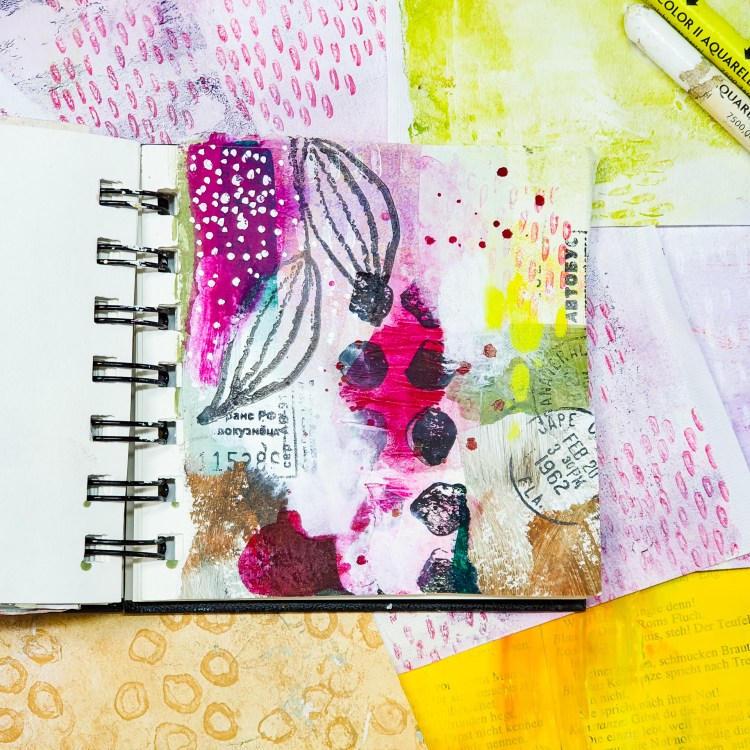 Im heutigen Video gestalte ich eine Seite im Mini Art Journal. Ich verwende dafür das kleine 10 x 10cm Sprialskizzenbuch vom Gerstaecker. Dieses kleine Büchlein bietet Platz für viele Papierreste und Experimente mit Farbe und Tinten. Abschließend kreiere ich Mark Makings mit Stempeln, Paint Pens und Neocolor Kreiden.