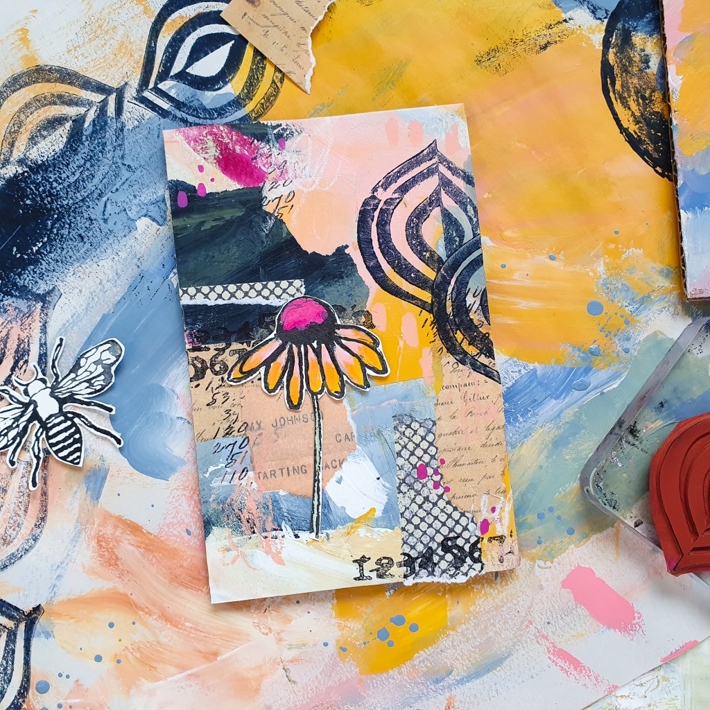Ich fand den Kartonuntergrund, den ich für die ATCs letzte Woche verwendet habe richtig toll und habe gleich nochmal ein Mixed Media Video damit gemacht. Heute gestalte ich ein kleines Kunstwerk mit Collage, Stempeln und Neocolor Kreiden auf einem Stück Karton.