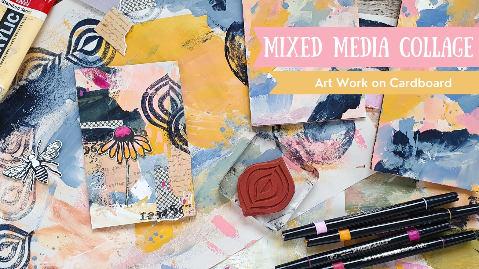 Ich fand den Kartonuntergrund, den ich für die ATCs letzte Woche verwendet habe richtig toll und habe gleich nochmal ein Mixed Media Video damit gemacht. Heute gestalte ich ein kleines Kunstwerk mit Collage, Stempeln und Neocolor Kreiden auf einem Stück Karton.