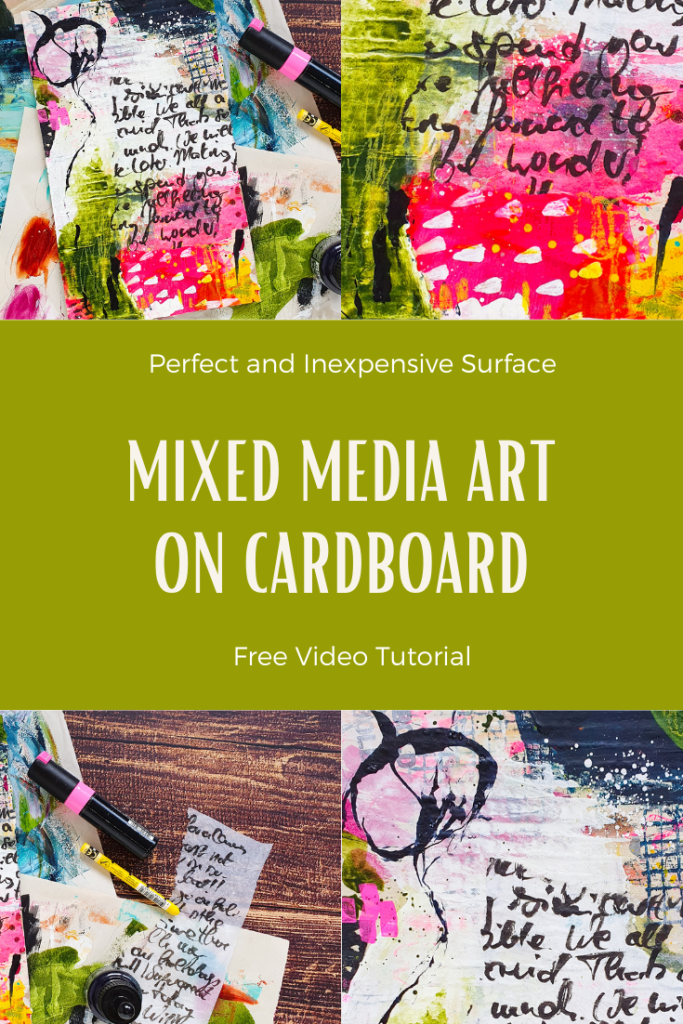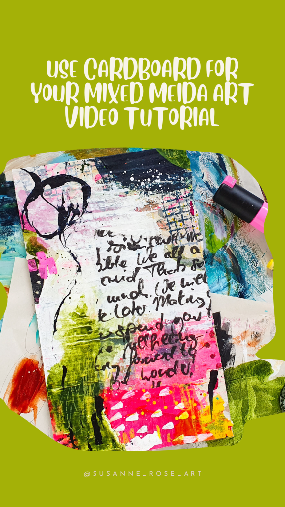 Ich fand den Kartonuntergrund, den ich in der letzten Zeit öfter verwendet habe richtig toll und habe gleich nochmal ein Mixed Media Video damit gemacht. Heute gestalte ich ein etwas größeres Kunstwerk mit Collage, Acrylfarben und Neocolor Kreiden auf einem Stück Karton.