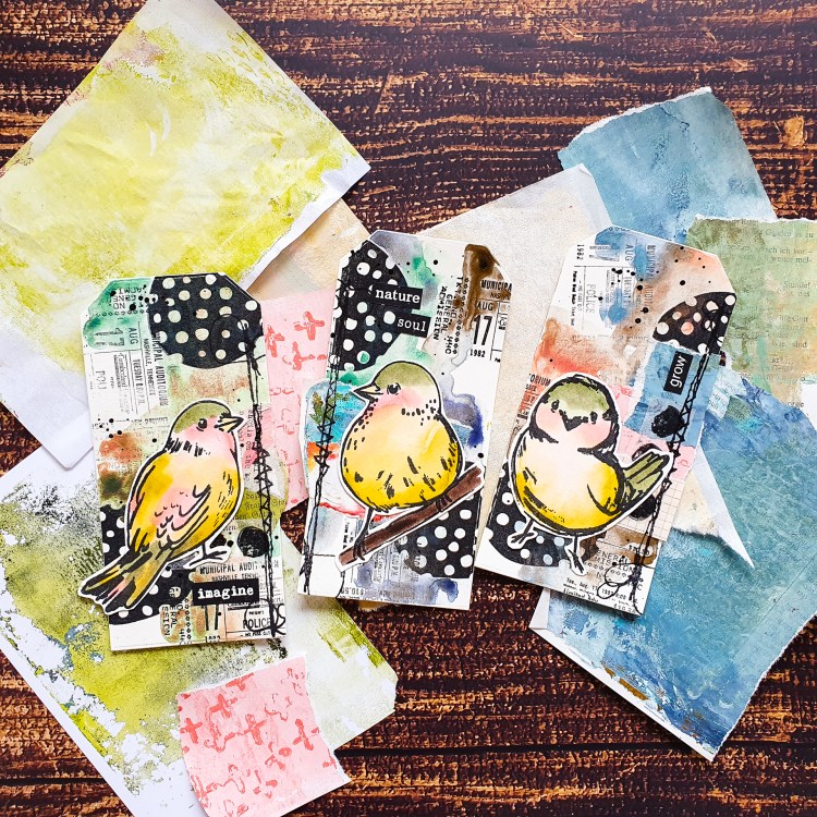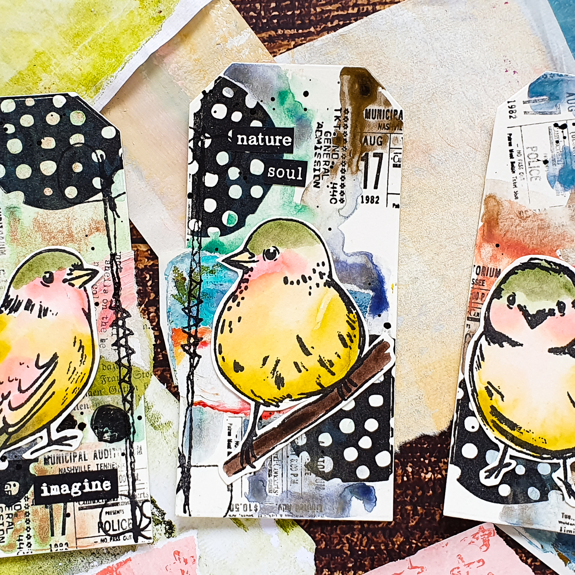 I’m sharing a video today using our brand new stamp sets. We have two new ones, a bird set and our Carved Collection 3 in the clear version. I’m making three mixed media collage tags today, using watercolors and collage. The new stamps are 10% off until tomorrow!