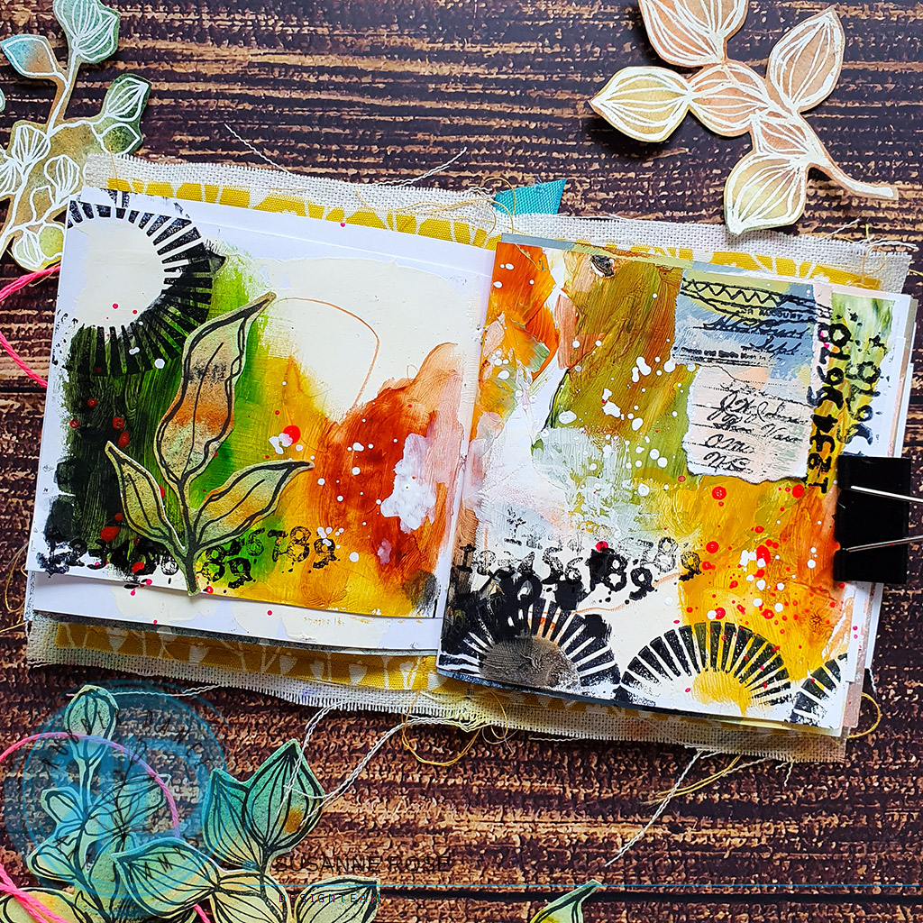 Hallo! Heute möchte ich dir einige der neusten Art Journal Seiten in meinen handgebundenen Journals zeigen. Ich arbeite in diesen kleinen Büchlein am liebsten mit Acrylfarben, Stempeln und Markmaking Tools. Dazu trage ich die Farben häufig einfach mit dem Finger auf. Anschließend ergänze ich Texturedn mit Stempeln und Kreiden. Als Hauptmotiv nutze ich Motive und Texte aus diversen Stempelset von Rubber Dance.