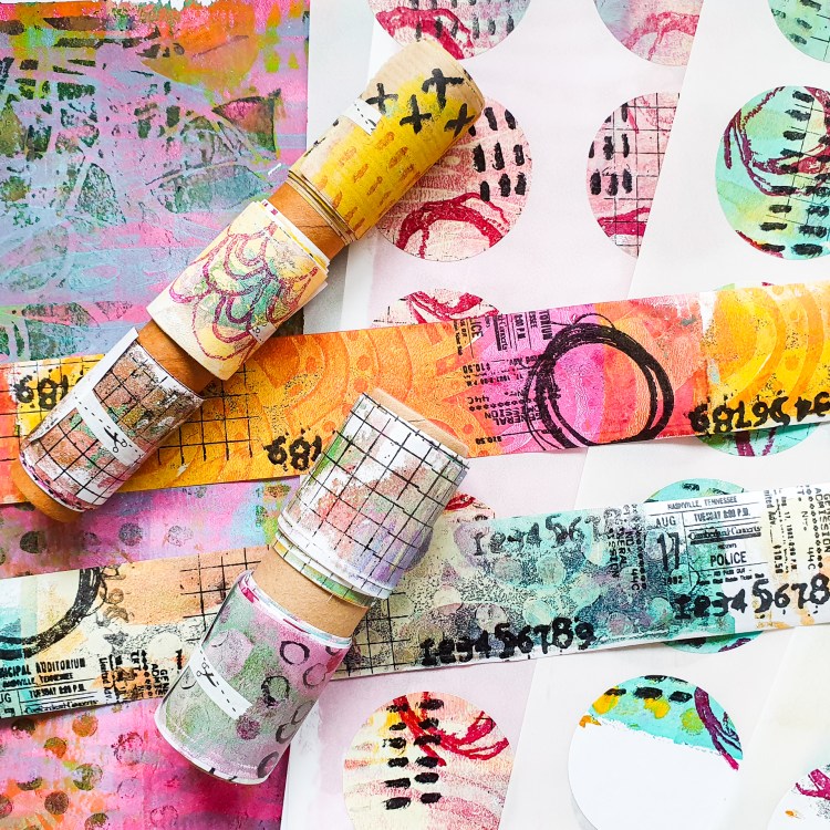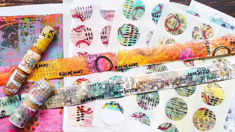 I recently made my own kind of washi tape using gummed paper tape together with a Gel Plate and some Stamps. I already shared some process clips over on my instagram page, but today I have a full video tutorial for you on my YouTube channel. As a little Bonus I’m also printing some stickers! These tapes are great for art collages, cardmaking, scrapbooking, mini albums and other papercrafting projects. You will find many ideas what to do with them over on my Instagram Page.