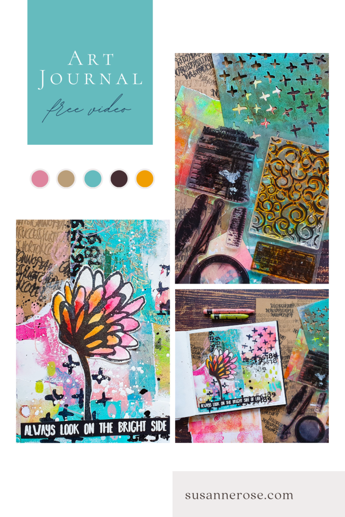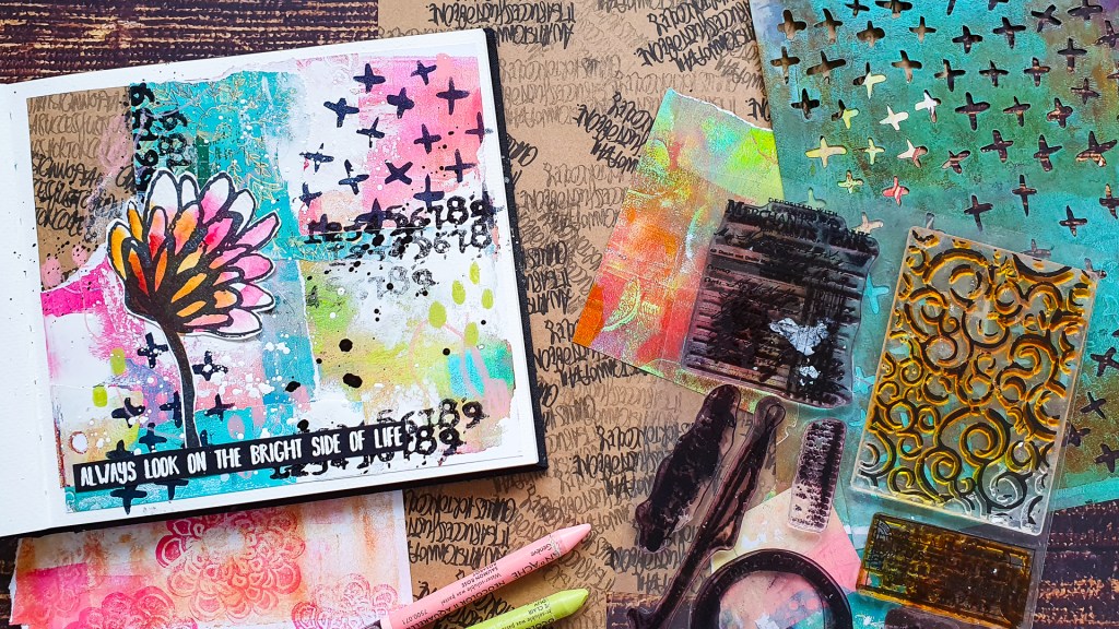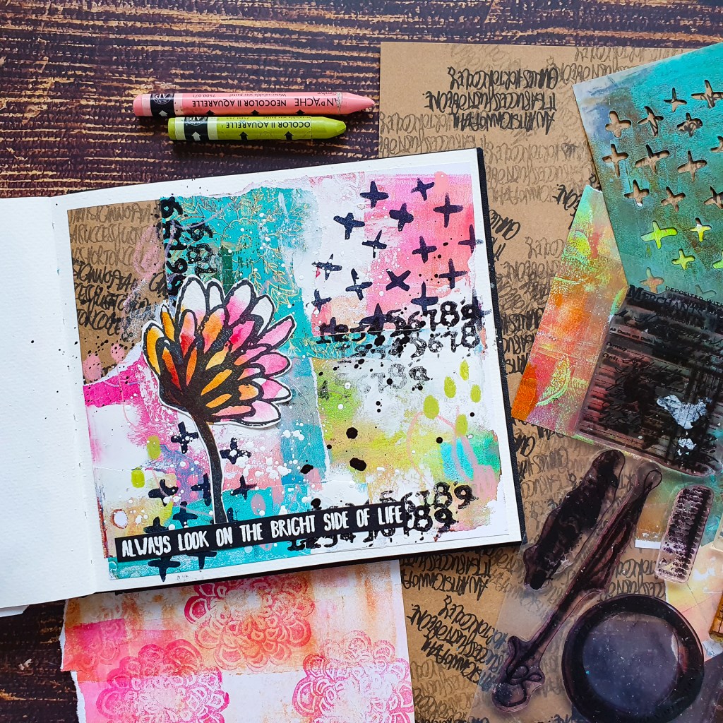 Hi everyone! I’m sharing an art journal tutorial today using gelli prints and handmade collage papers for the background combined with some stenciling, stamping and mark making! I love this way to start a journal page! It’s super easy, intuitive and gives you interesting results! Yesterday we updated our shop and added two new stamp sets and ten stencils! All the new products are 10% off until next week Friday the 23rd of June. The stencils are limited, so when they are gone, they are gone. Jump over to the shop to have look at the new stuff or visit our shop blog for some creative inspiration on the new art supplies!