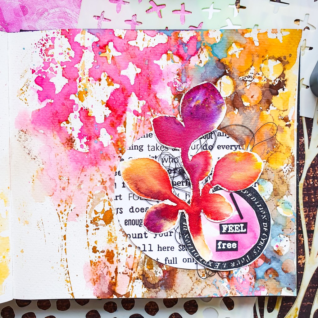 Hi everyone! I am playing in my watercolor journal today using Distress Inks and Distress Oxides together with some of our new stencils. This technique creates a lovely layered background that can be used not only for art journaling also for other mixed media projects like cards, atcs or tags. I am inking up the stencils, spritz them with water and then use them like a stamp to get an impression on my pages. I am drying the layers inbetween to avoid mud and to get a more dimensional look.