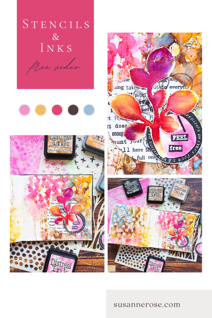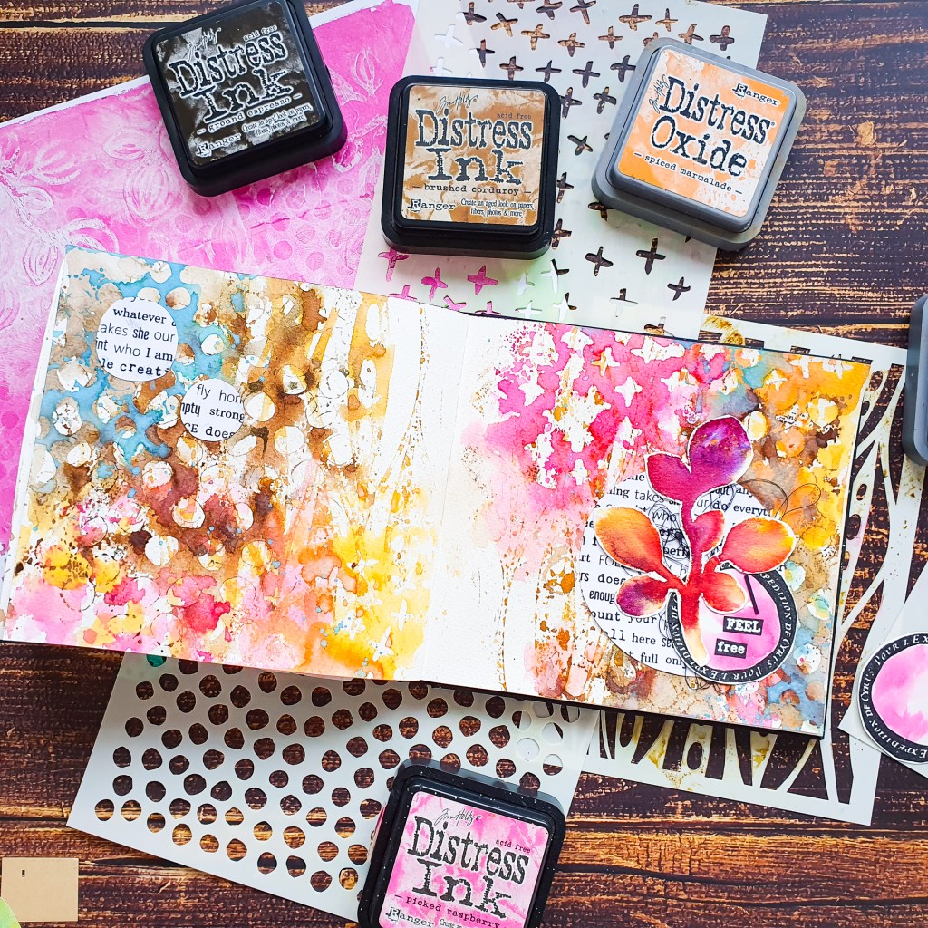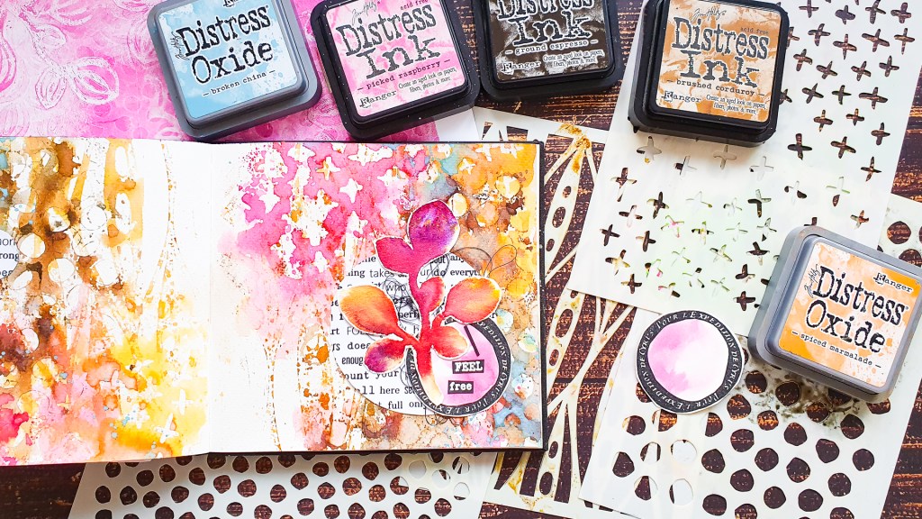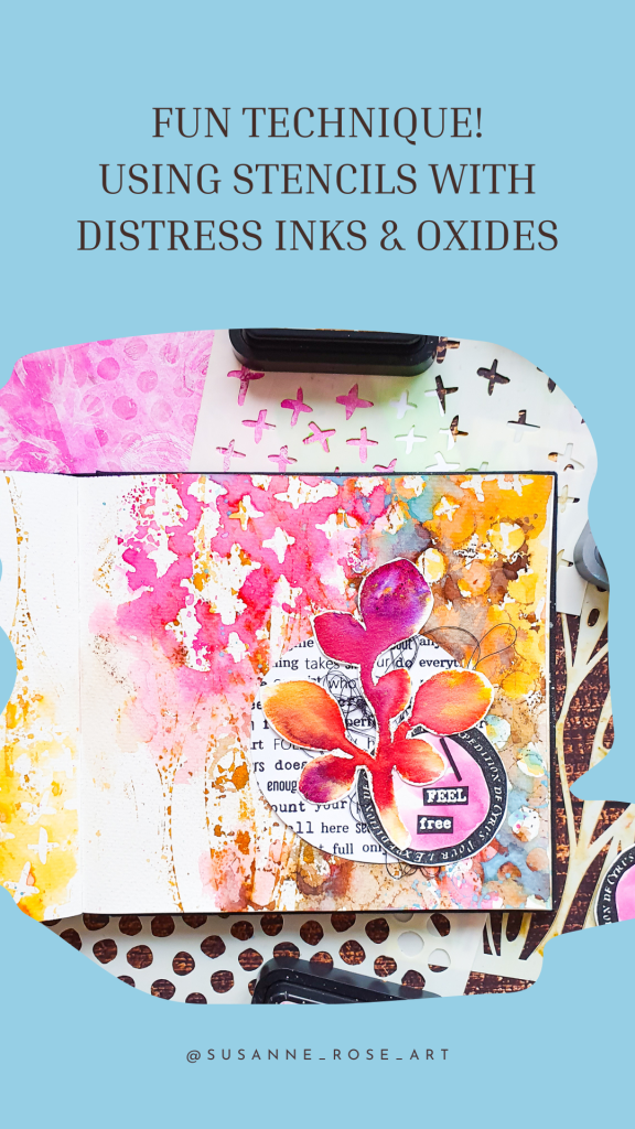 Halli hallo. Heute gestalte ich eine Art Journal Seite im Aquarellbuch von Kunst und Papier. Den Hintergrund mache ich mit einigen unserer neuen Schablonen kombiniert mit Distress Ink und Distress Oxide Stempelkissen. Mit dieser Technik entsteht ein wunderschöner geschichteter Hintergrund mit viel Textur. Die einzelnen Schichten trockne ich zwischendurch, damit die Farben am Ende nicht matschig aussehen.