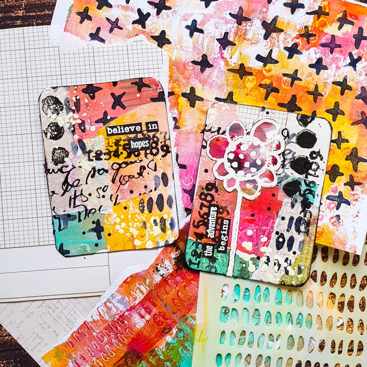 Hi everyone! In today’s video I am using up some of my collage scraps! I always try to get rid of the small bits an pieces. I am making two mixed media journal cards today. You can use this technique for all kinds of projects, for ATCs or greeting cards and of course in your art journal, too. The cards I am creating are great to use in your handmade journals or scrapbook albums.