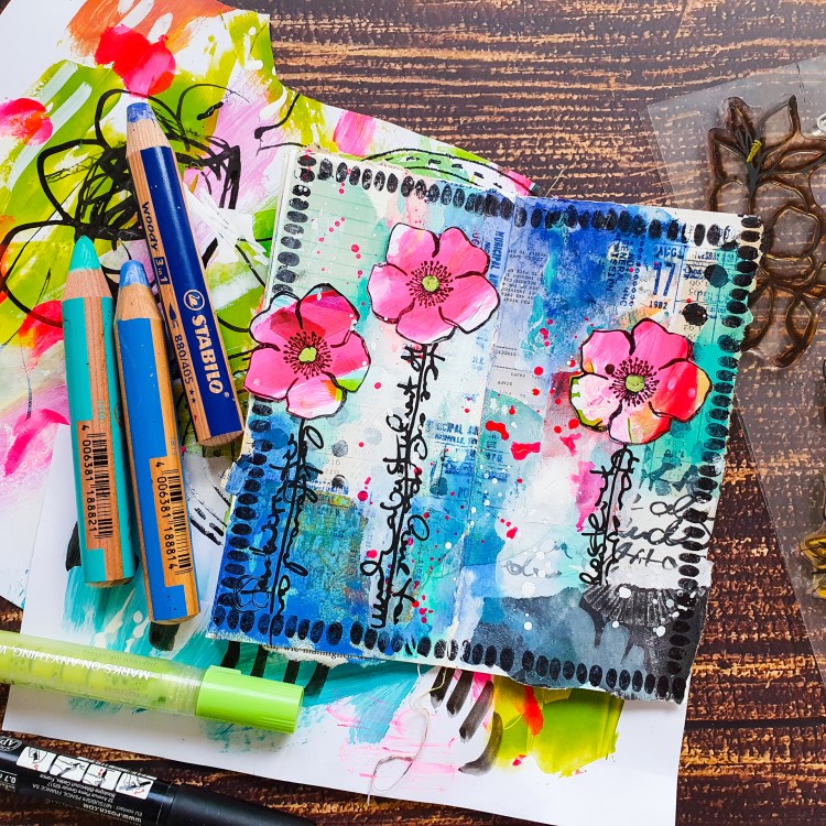 For the background collage I used some paper scraps I had laying around. The flowers are stamped onto one of my left over paint papers. I will give you a list of the materials at the end of the post. I will also note done some alternatives to Stabilo Woodys.