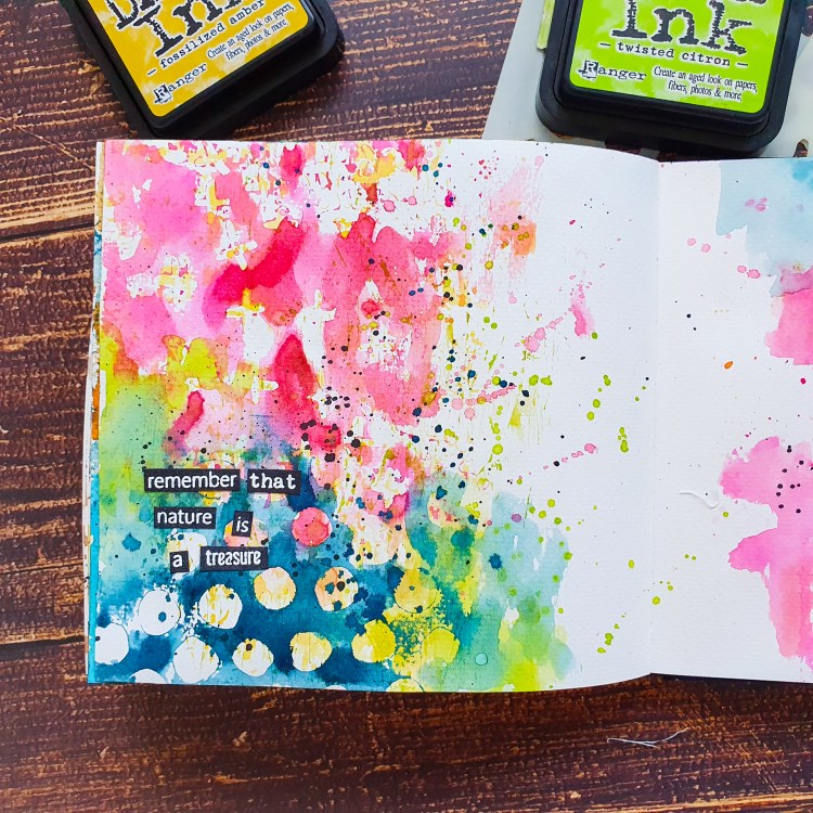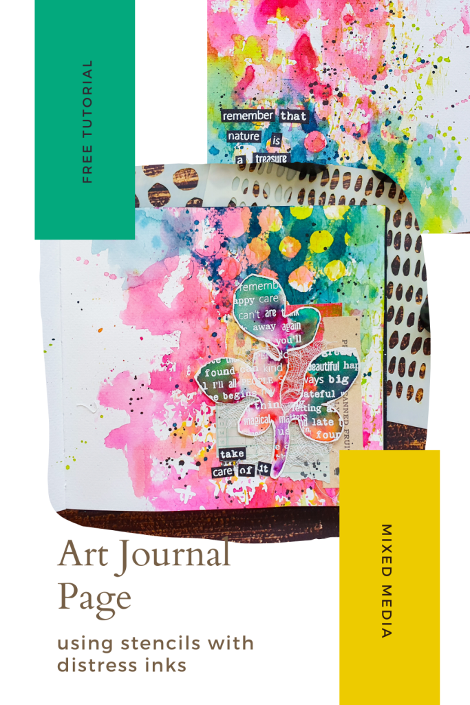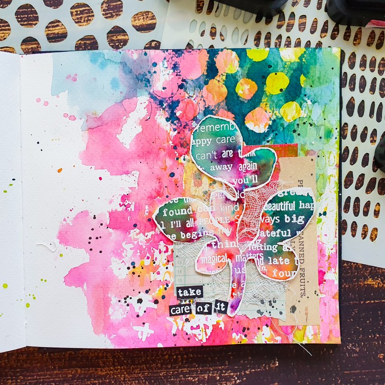 Halli hallo. Heute gestalte ich nochmal eine Art Journal Seite im Aquarellbuch von Kunst und Papier. Den Hintergrund mache ich mit einigen unserer Schablonen kombiniert mit Distress Ink Stempelkissen. Mit dieser Technik entsteht ein wunderschöner geschichteter Hintergrund mit viel Textur. Die einzelnen Schichten trockne ich zwischendurch, damit die Farben am Ende nicht matschig aussehen.