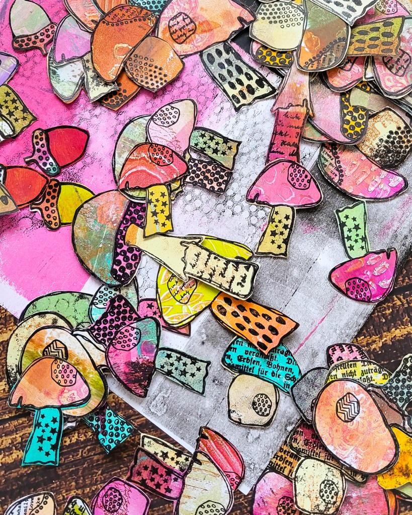 Hallo ihr Lieben. Heute habe ich eine kleine Inspiration zum Thema Collage Fodder bzw. Stempel kolorieren mal anders. Dieses Projekt ist perfekt geeignet für einen kühlen und grauen Sonntag auf der Couch. Ich verwende mein Textured Mushrooms Stempelset und einige Gelliprints um viele süße Pilze für diverse Papierprojekte zu gestatlten. Sie eignen sich perfekt für Mixed Media Projekte, Art Journal Seiten, Grußkarten oder Scrapbook-Layouts.
