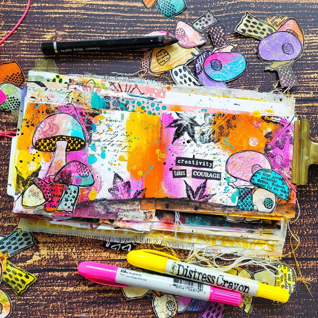Hier siehst du eine Seite in meinem handgemachten Art Journal, auf der ich die Pilze schon verwendet habe.