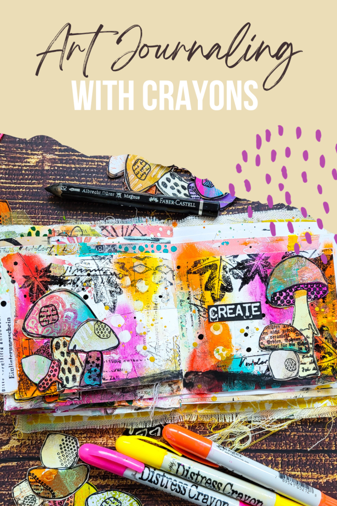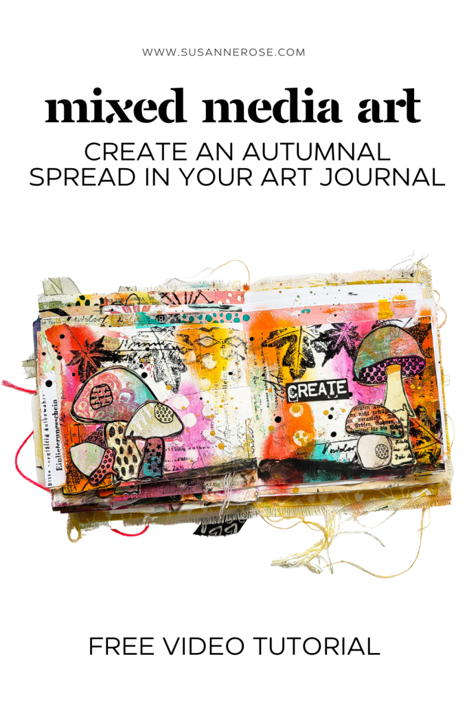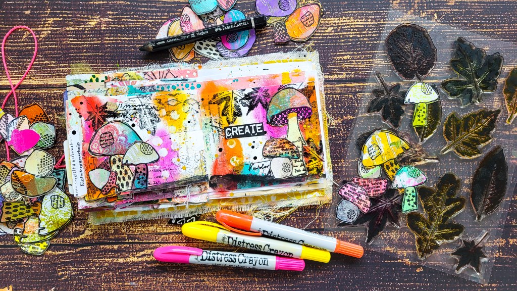 Halli hallo! Heute zeige ich eine herbstliche Art Journal Seite in einem meiner handgebundenen Junk Journals. Als Hauptmotiv verwende ich einige Pilze aus meinem Textured Mushrooms Stempelset. Für den Hintergrund habe ich der Reihenfolge nach Collage, Gesso und Distress Crayons verwendet. Mit der Small Ink Dots Schablone hab ich mit Hilfe eines feuchten Tuchs wieder etwas von der Farbe der Crayons entfernt. Anschließend kam noch etwas Textur mit Motiven aus dem Mix It Up 4 Stempelset hinzu. Mit den Blättern aus meinem Autumn Leaves Stempelset habe ich eine Art Rahmen für die Seite gestaltet.