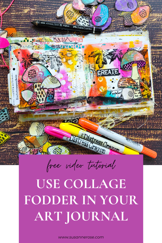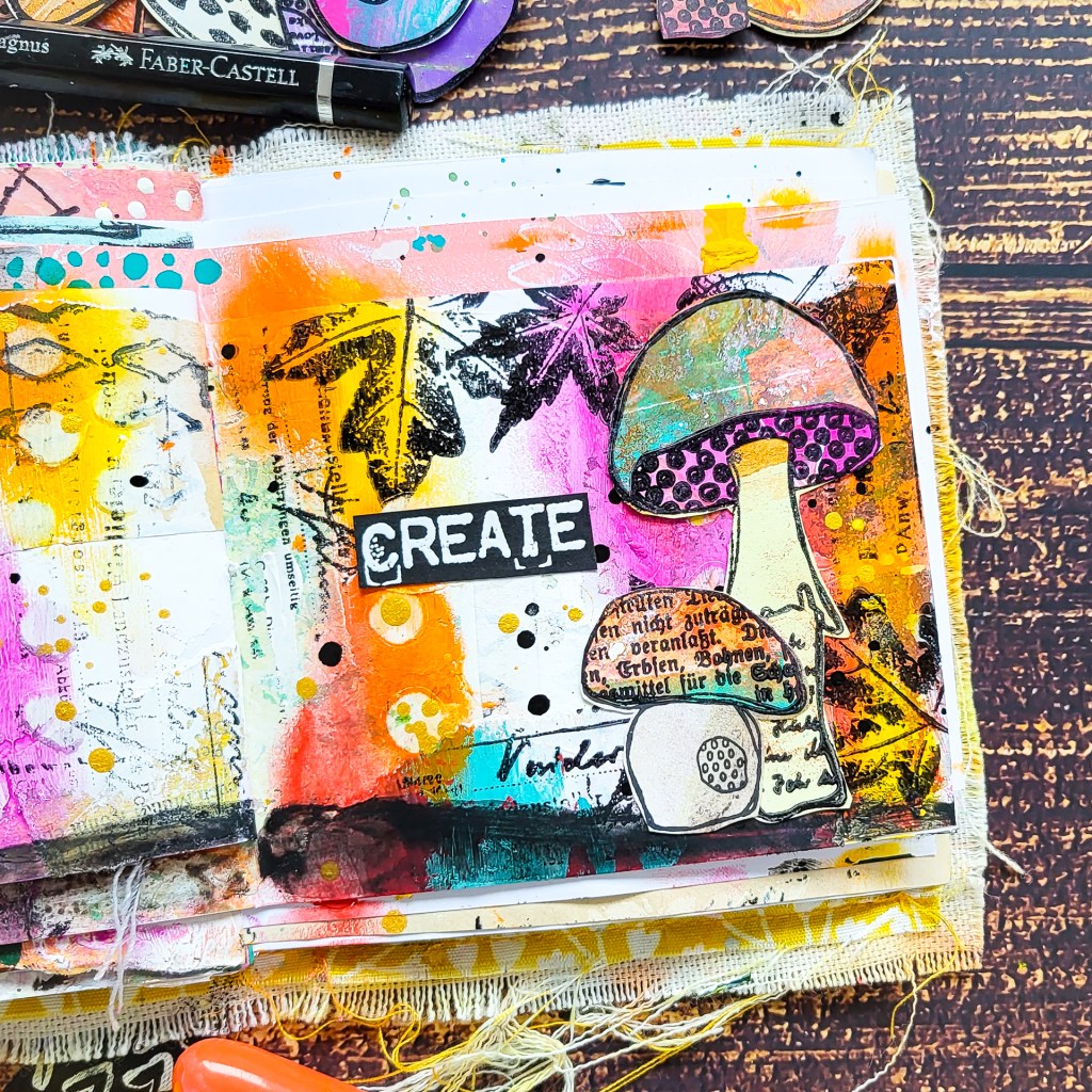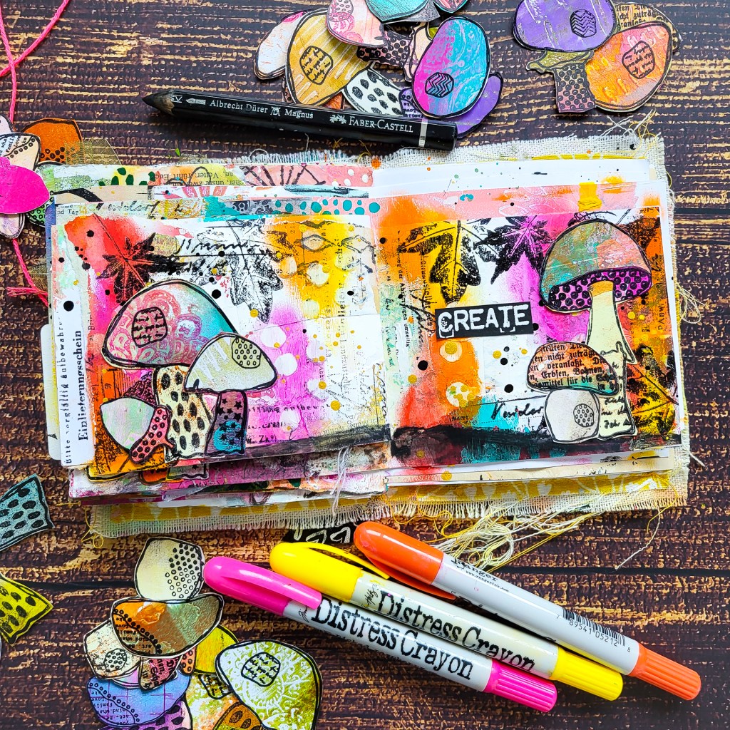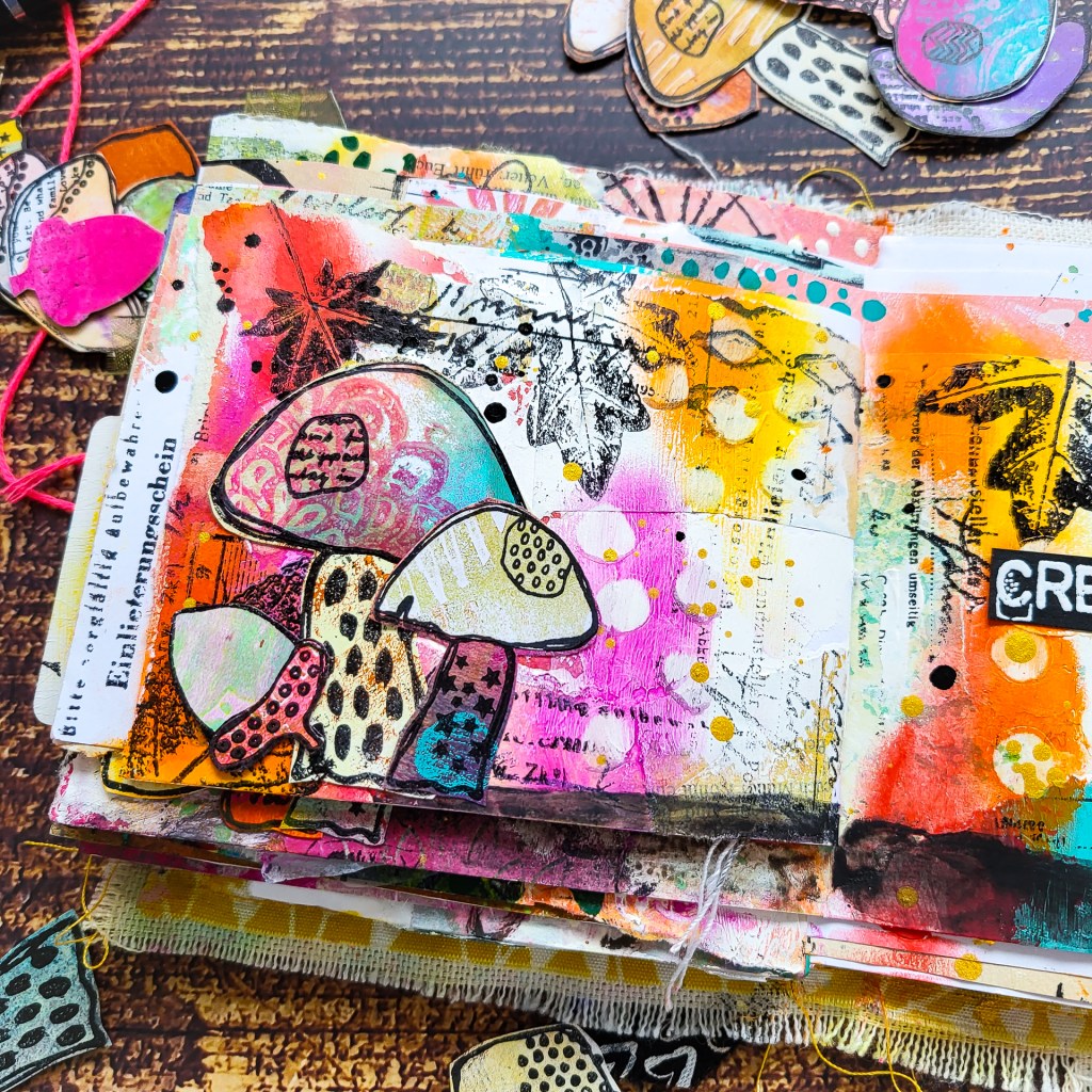 Hi everyone! I’m sharing a spread in one of my handmade junk art journals today using the cute mushrooms from my Textured Mushrooms stamp set.