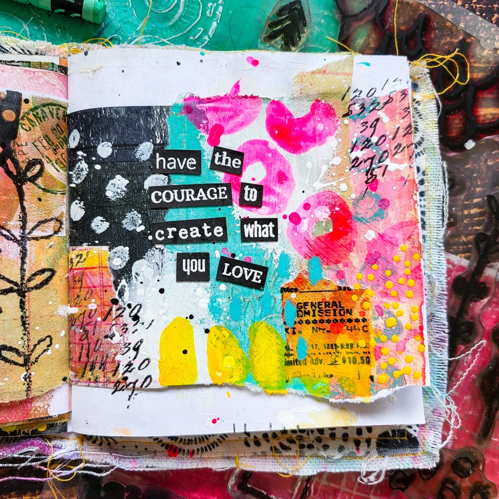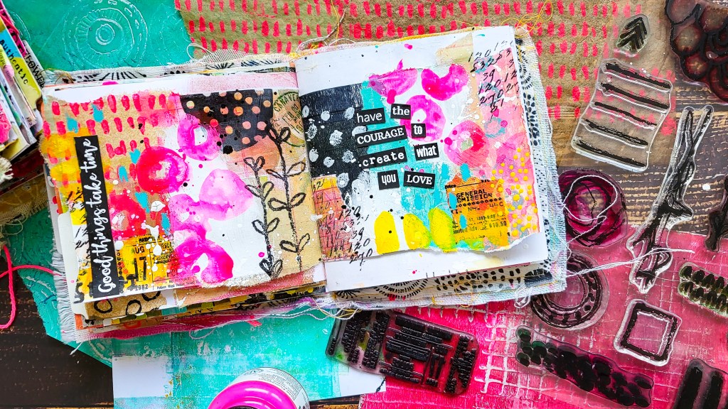 Hi everyone! I’m sharing a spread in one of my handmade junk art journals today, playing with Collage, Stamps, Acrylic Inks and Mark Making. I pulled out my handmade Washi Tape for this spread as well. I recently really enjoy playing loosely in these little books. On this one I especially love the colour combo. I think neon pink with the kraft color, yellow and black is amazing.