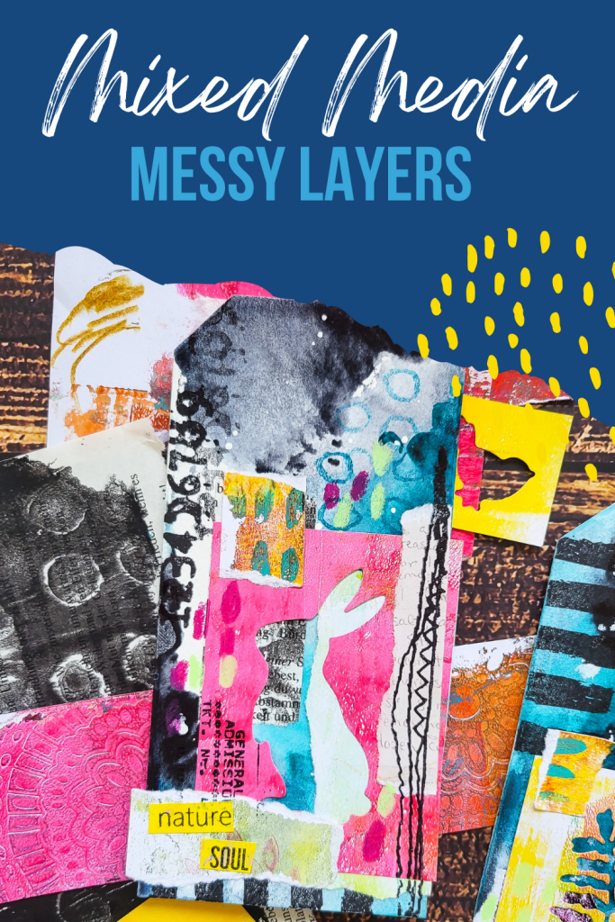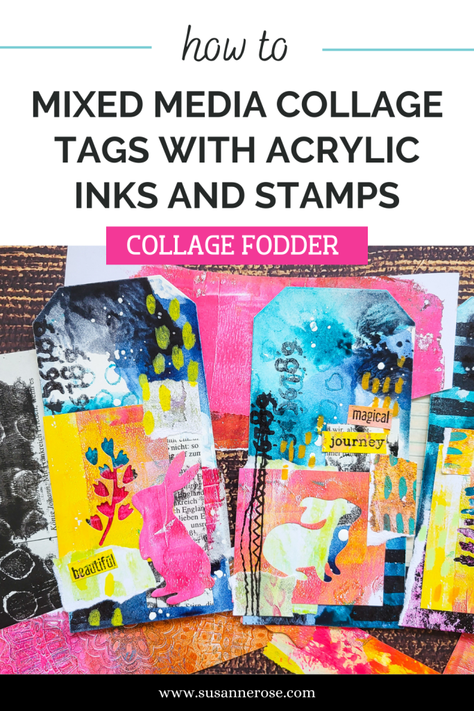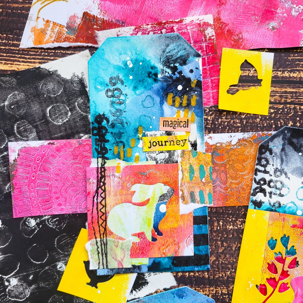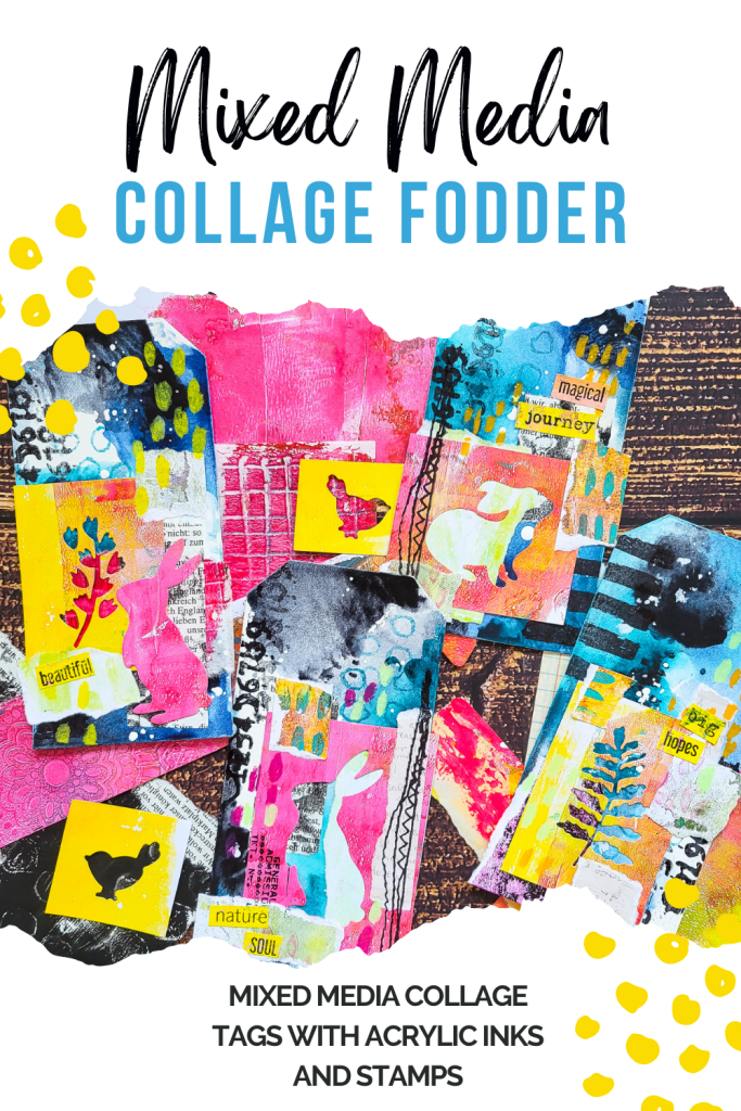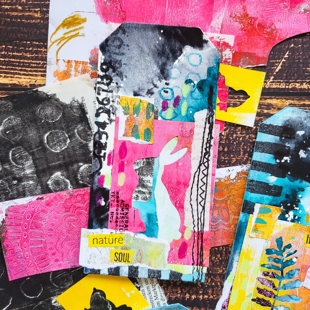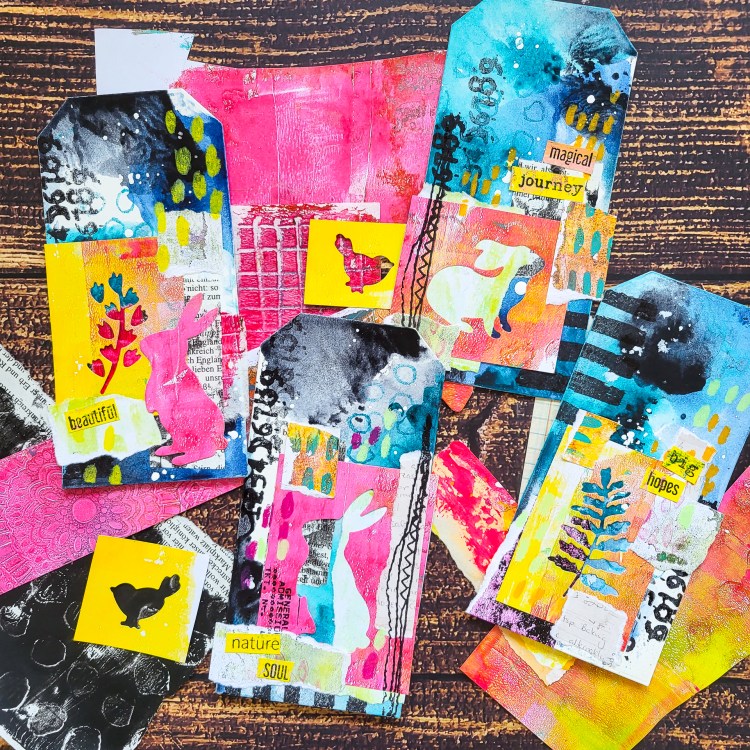 Hi everyone! Today I am sharing a set of four mixed media collage tags using fluid acrylic paint combined with some stamps and a lot of collage paper scraps. Some of the scraps I die cut with my Sizzix Big shot with rabbit dies, birds and some branches. These make very interesting negative space images to put onto the tags. It’s a fabulous project today if you want to get rid of some paper left overs and if you are in the mood to mess around with paints or inks.