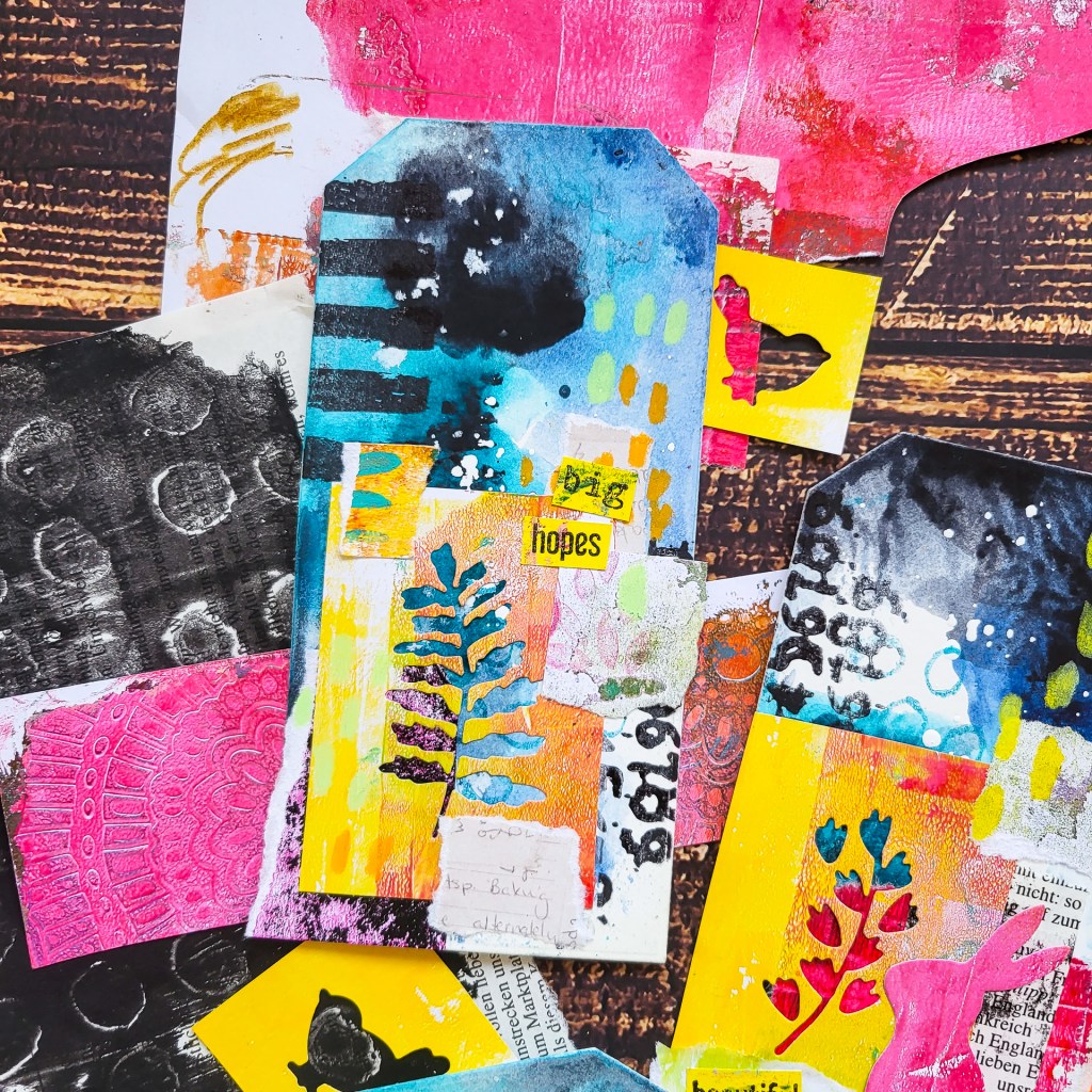 Halli hallo! Heute habe ich ein Set mit Vier Mixed Media Tags für dich. Ich gestalte einen Hintergrund mit Acrylfarben und verwende viele übriggebliebene Collage Schnipsel. Einige von Ihnen stanze ich mit meiner Sizzix Big Shot und Kaninchen, Vogel und Blättermotiven. Diese “Rahmen” eignen sich ganz prima für eine Interessante Collage-Schicht. Dieses Projekt ist perfekt, wenn du noch übrige Schnipsel hast und ein bisschen Lust auf Farbe an den Händen.