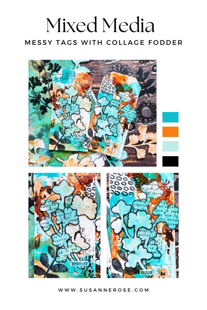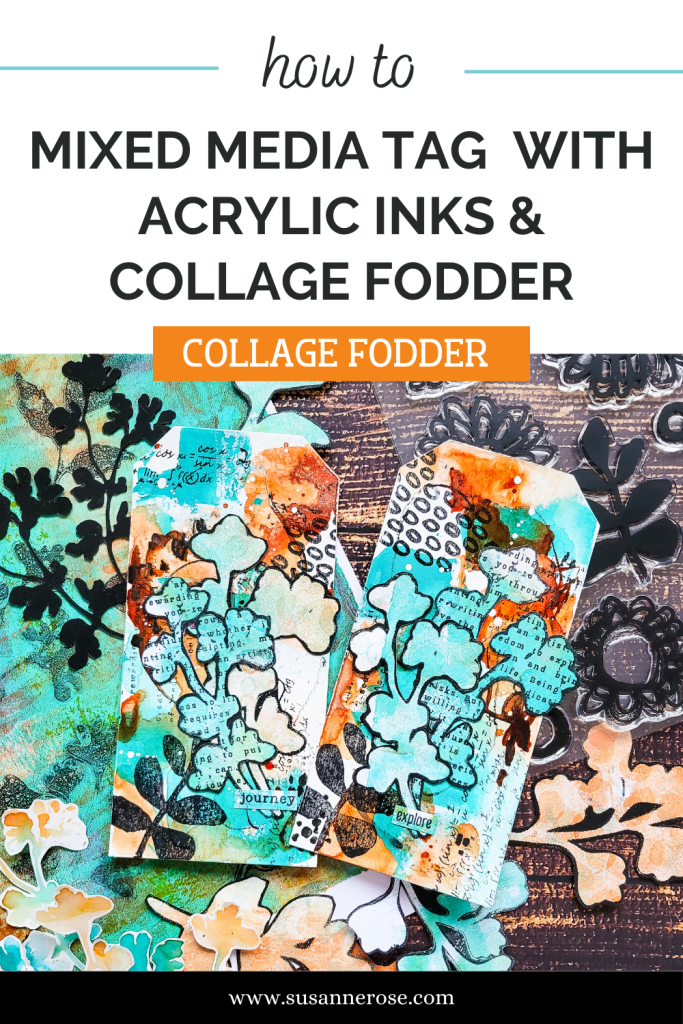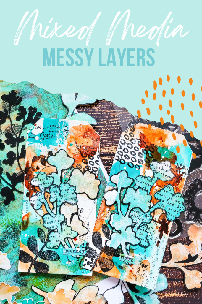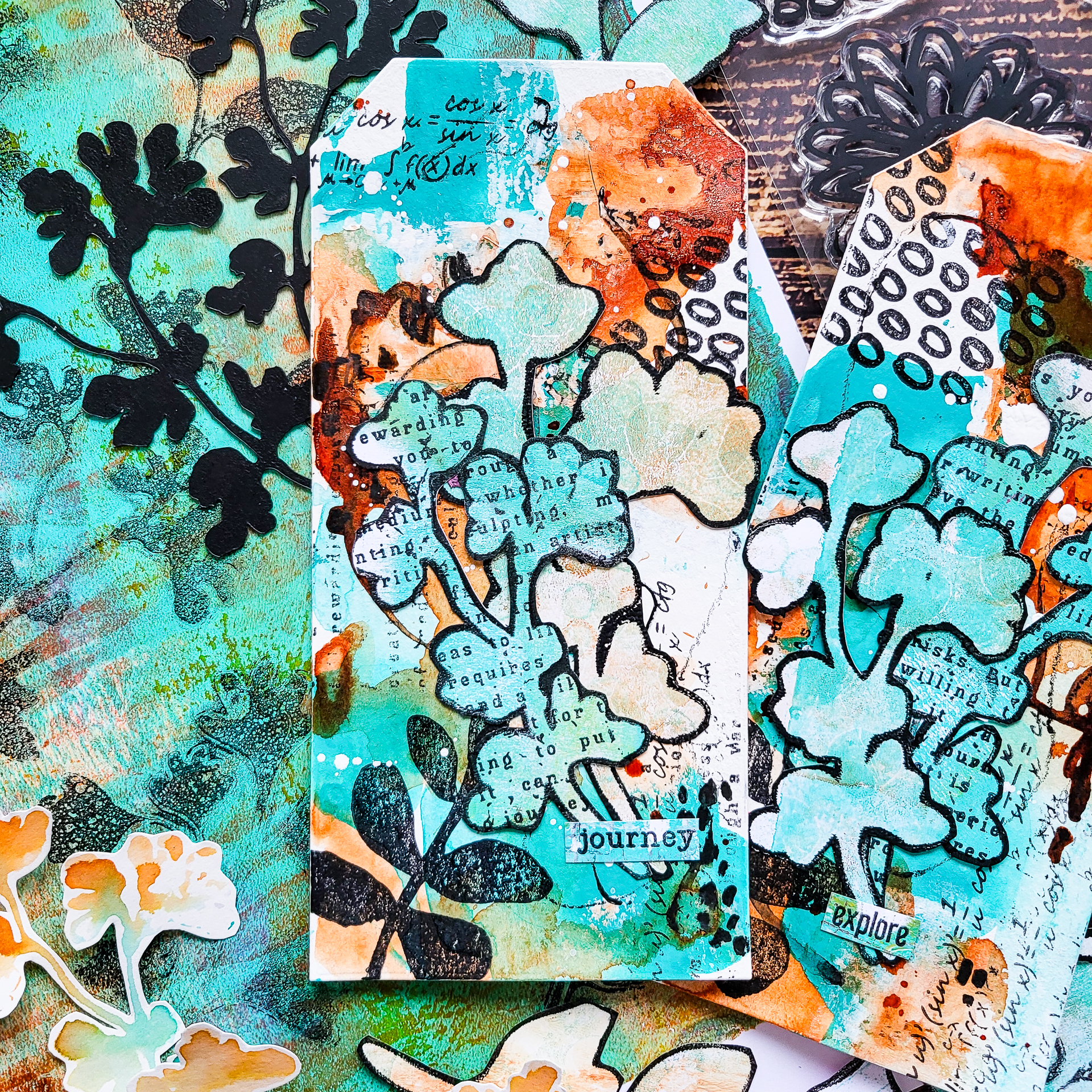 Hi everyone! Today I am sharing a couple of mixed media tags with a stamped acrylic ink background and some gelli printed collage fodder. I am working with our new stamps and stencils which are available over in our shop already! They are 10% off until tomorrow Feb. 4th!
