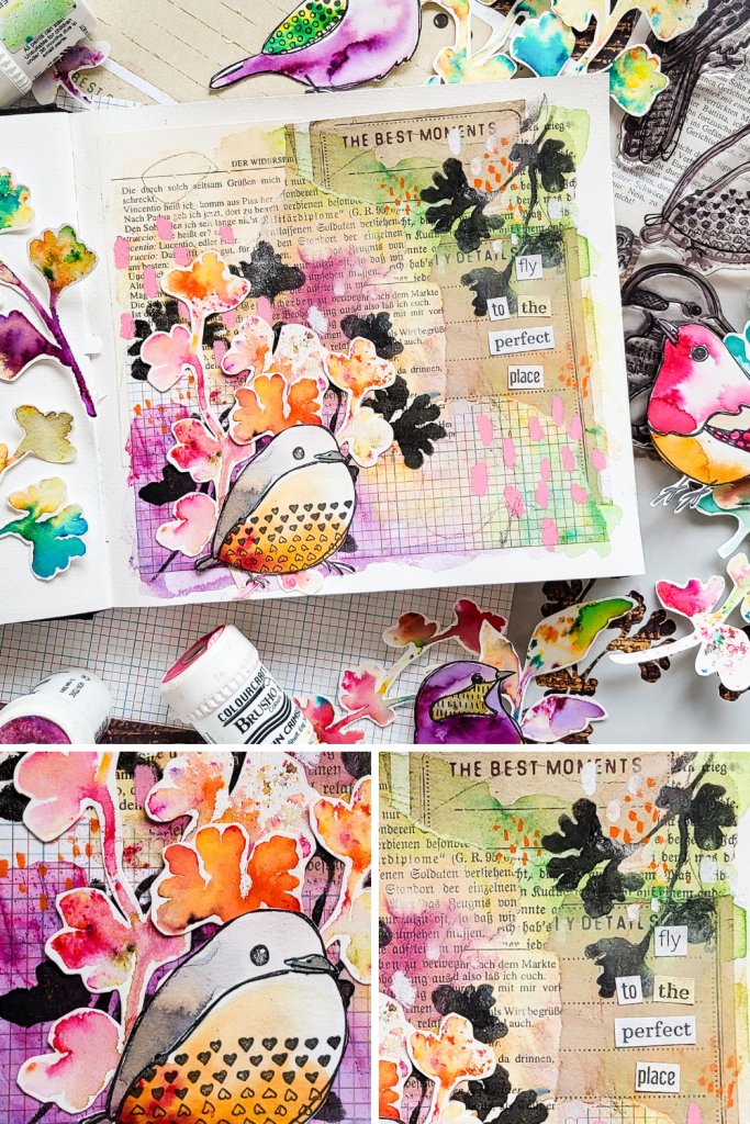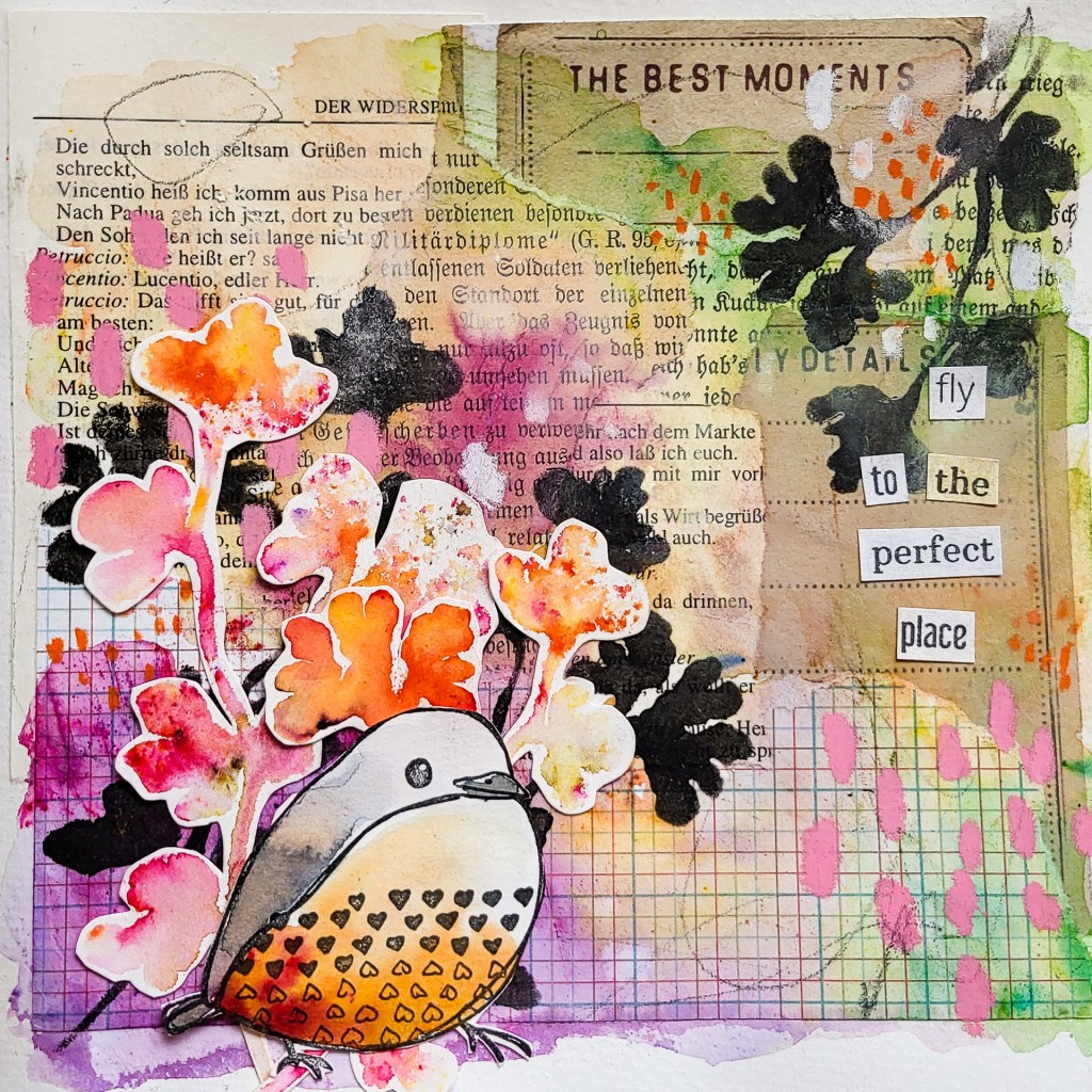 Halli hallo. Ich zeige heute eine Art Journal Seite mit Collage, Brusho Pigmenten, Stempeln und Markmakings. Mit Hilfe meiner neuen Sketchy Leaves 4 Schablone kreiere ich einige Collage Elemente zusammen mit den Brusho Pulvern. Ich verwende sie außerdem zum Koloieren meines Hauptmotivs aus dem Textured Birds 2 Stempelset und für den Hintergrund.