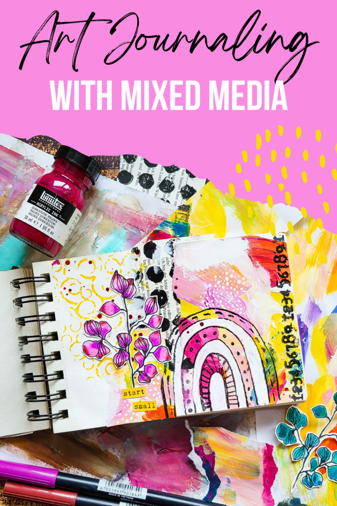 Hi everyone! I’m sharing an abstract art journal collage in one of my cheap spiral bound sketchbooks today. I am using left over paint papers and stamped old book papers for collage. My focal images are the rainbow stamp from the Pencil Marks 3 stamp set and one or the Sketchy Leaves. I combined the collage with some white gesso, mark making and background stamping. The title are words from my Mix A Sentiment stamp set.