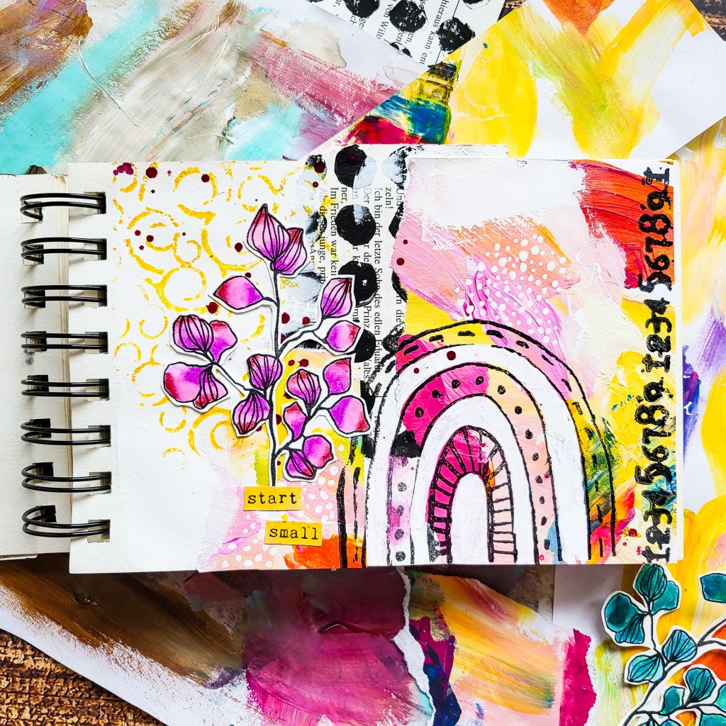 Halli hallo. Ich zeige heute eine abstrakte Collage in meinem Spiral-Journal. Das ist ein einfacher billiger Skizzenblock vom Action. Ich verwende handgemachte Collagepapiere und eine bestempelte alte Buchseite für den Hintergrund. Meine Hauptmotive sind der Regenbogen aus dem Pencil Marks 3 Stempelset und ein Blätterstempel aus dem Sketchy Leaves Set. Den Collage-Hintergrund habe ich mit Gesso, Markmakings und Hintergrundstempeln kombiniert. Den Titel habe ich mit Wörtern aus unserem Mix A Sentiment Stempelset zusammengesetzt.
