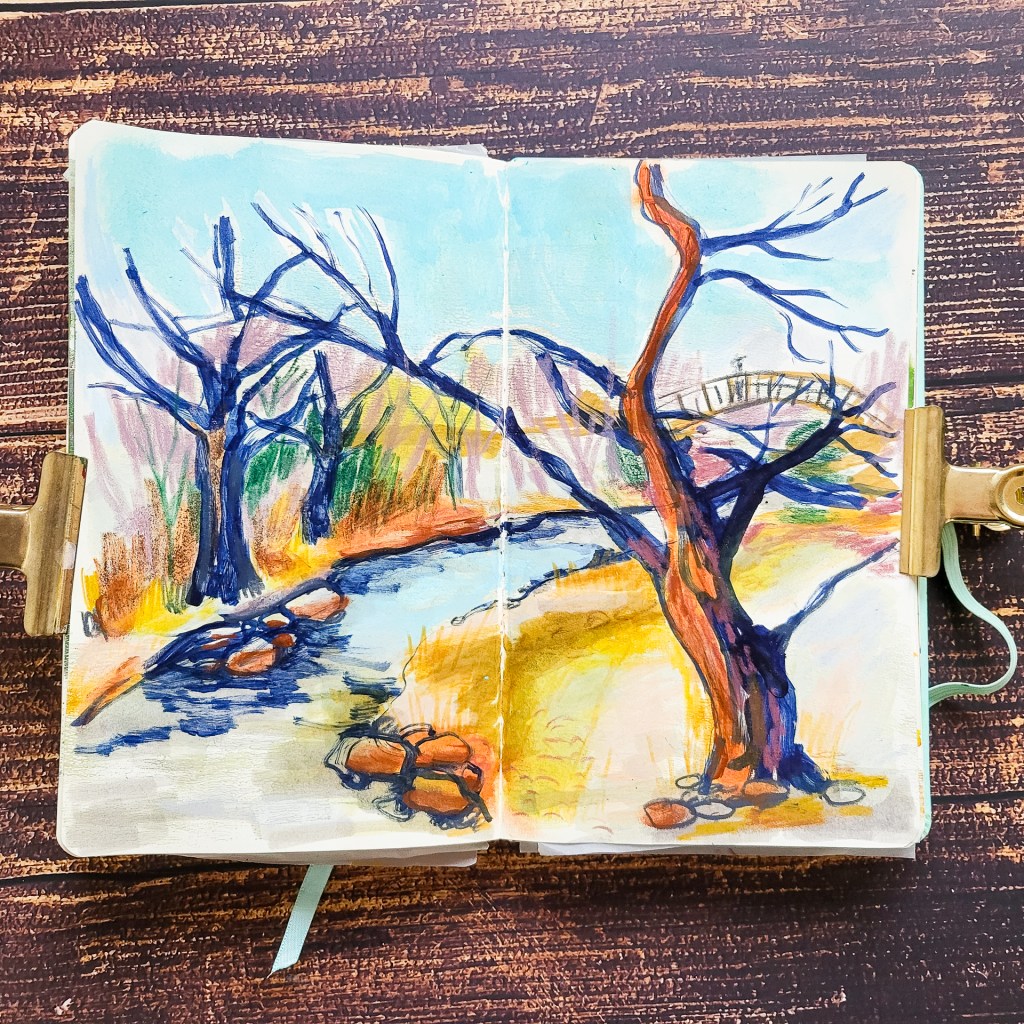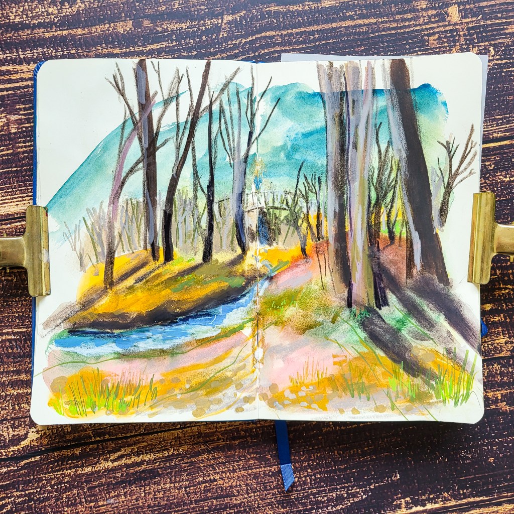 I love going out to draw and have a play in my sketchbook. It’s so much different compared to drawing from photos, but of course it takes a lot more effort. Often I sketch on location, then take photos and make more detailed spreads with more mediums at home. Today I am sharing some spread that are all inspired by places close to my home.