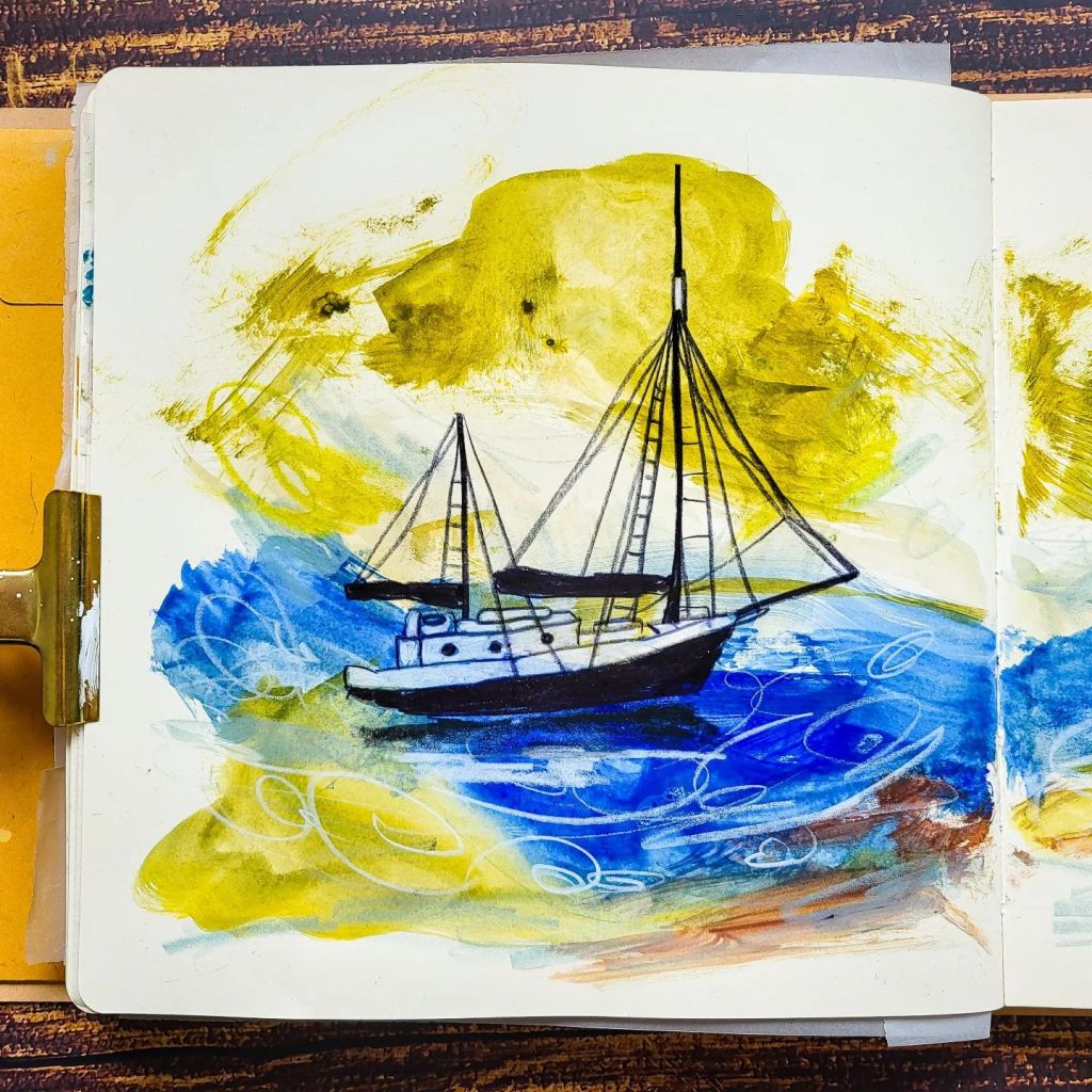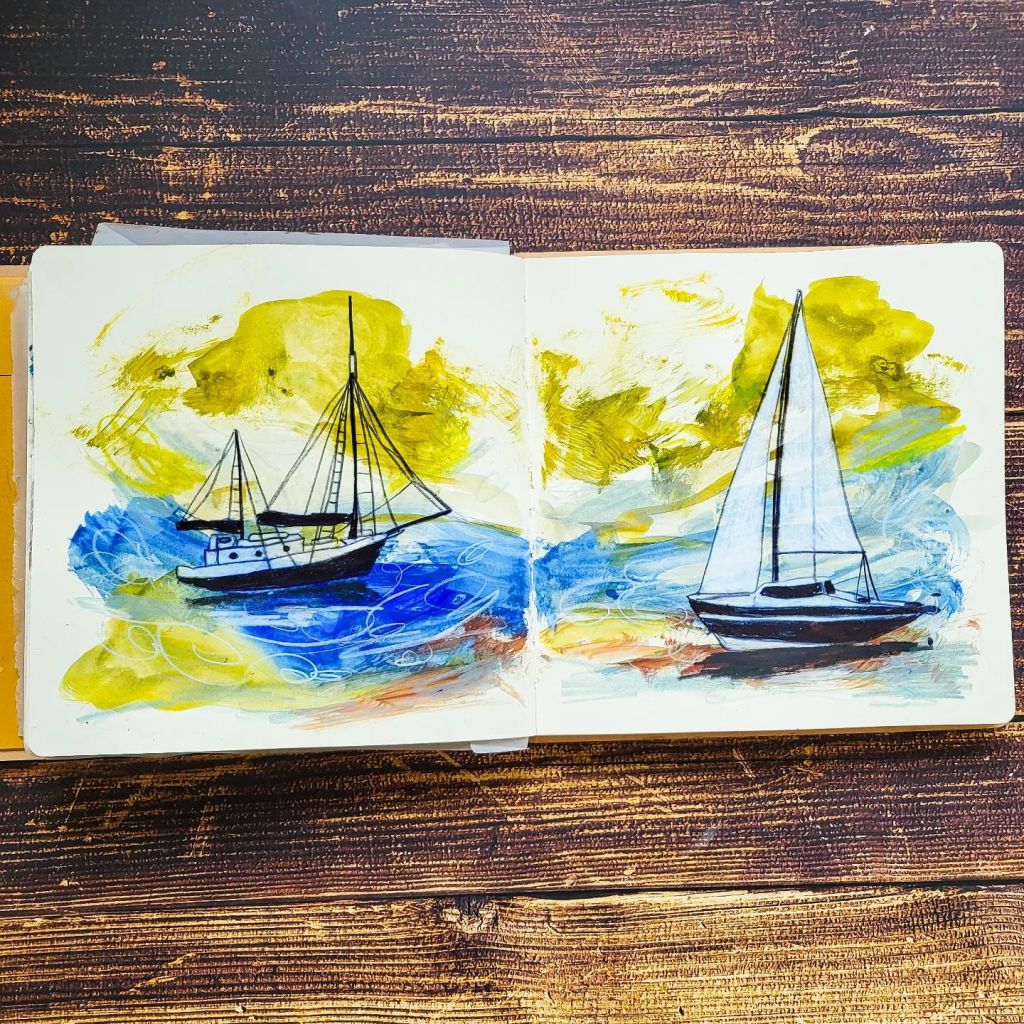One thing I love doing is drawing on a prepped sketchbook page. This spread is done in my Ranger Journal with a background using Flash Paints from LeFrance & Bourgeoise. These paints are similar to acrylic gouache. They are drying mat and permanent. I love using them as a base layer in my sketchbook. As they are not sticky, it’s easy to work on top with all kinds of different materials.