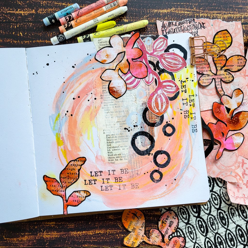 Hallo zusammen. Heute zeige ich wieder eine Seite im Art Journal vom Action. Ich starte mit ein wenig Collage mit neutralen Papieren und ergänze anschließen Farbe mit Neocolor II Kreiden. Das ganze runde ich ab mit schwarzen Stempelmotiven aus unserem Pencil Marks 7 Stempelset um den Kontrast zu erhöhen und etwas Collagefodder.