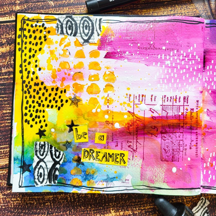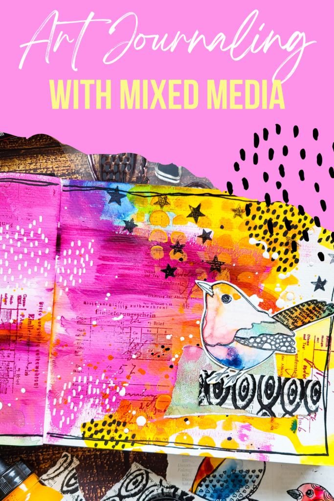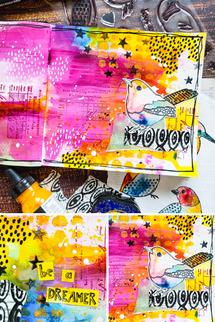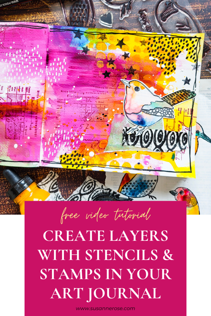 Hi everybody. I am sharing a new art journaling video tutorial today with an acrylic background using some stamps and stencils. I am adding mark makings for depth and a lovely bird as the focal image from my Textured Birds 2 stamp set. I limited my palette to almost only violett and yellow, to keep ich complementary and interesting.