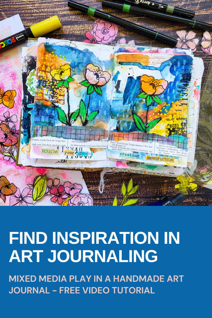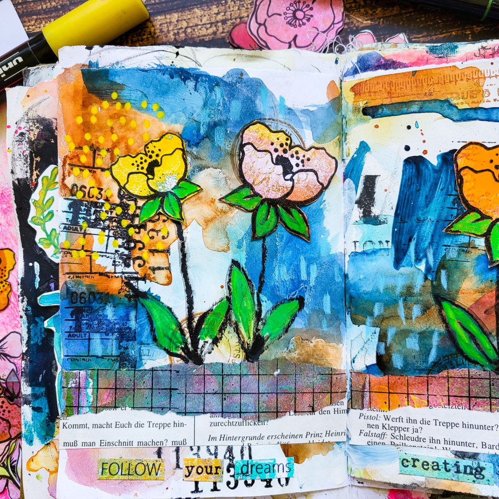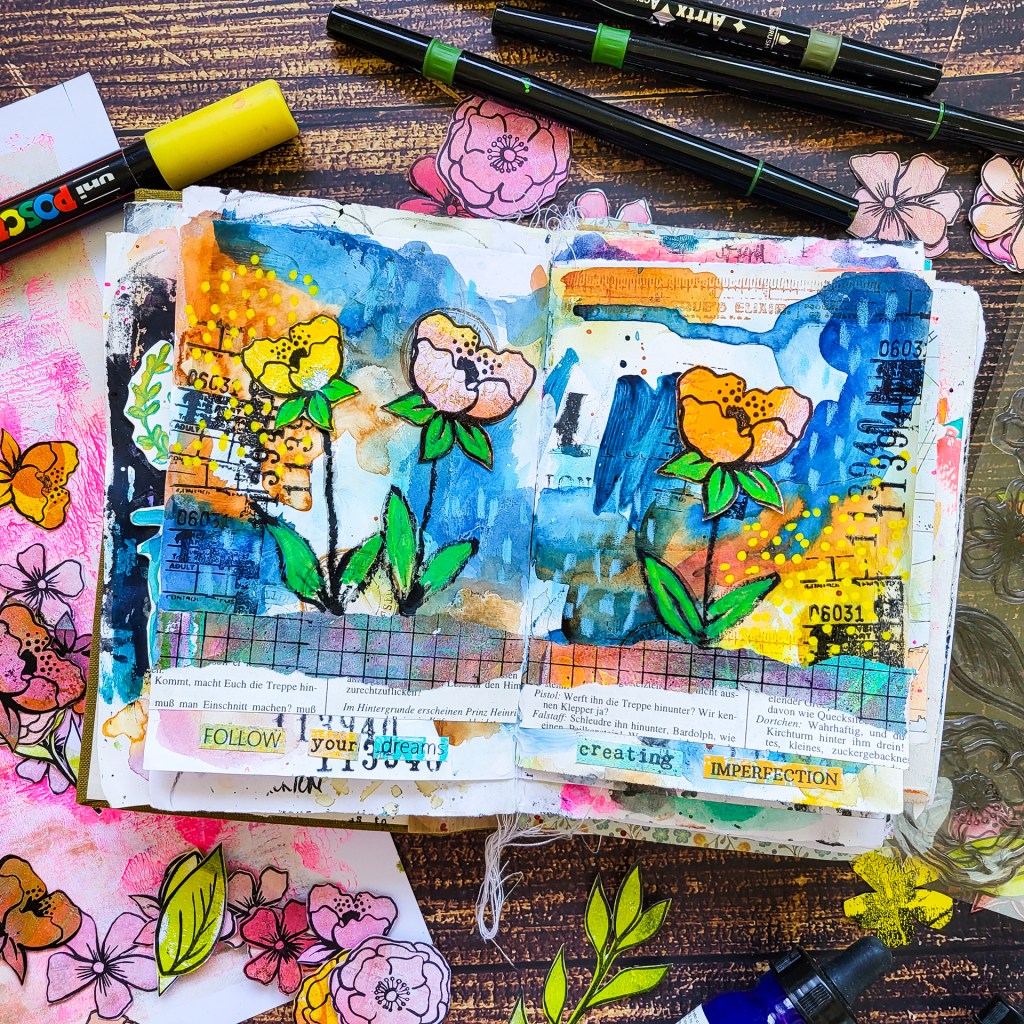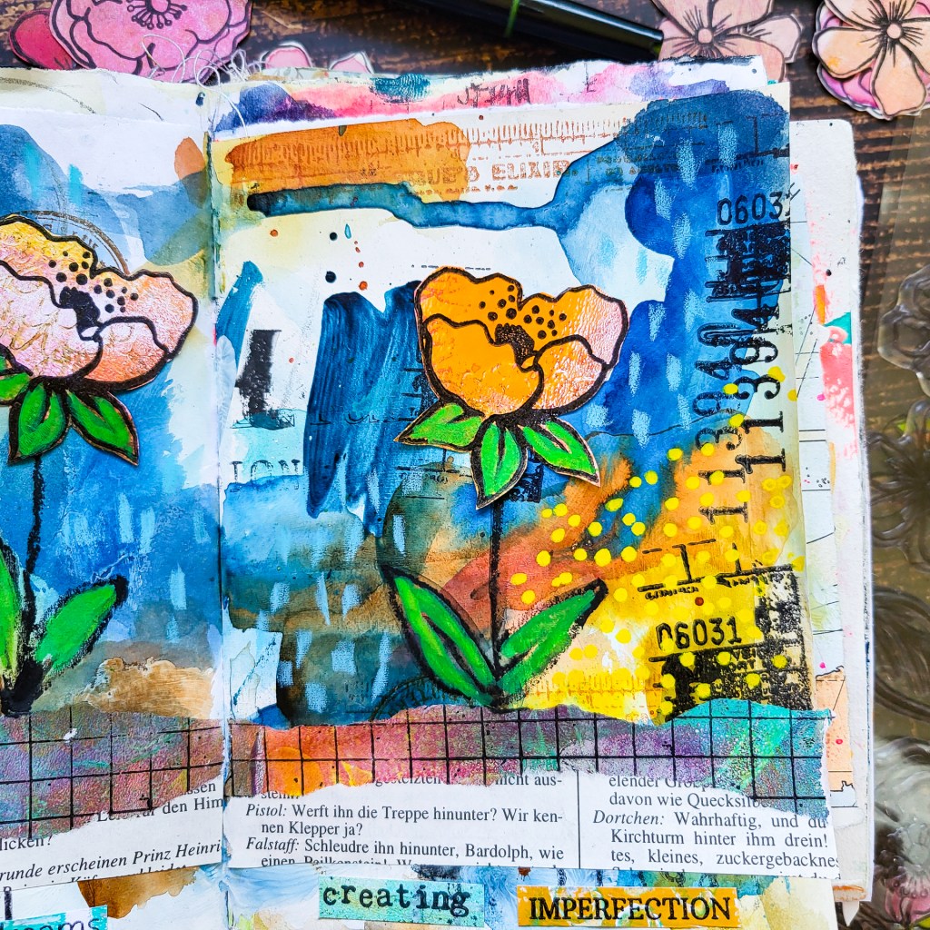 Hallo zusammen! Heute zeige ich mal wieder eine mixed media Seite in meinem handgemachten Junk Art Journal. Ich verwende die Blumenstempel aus meinem Loose Florals Set zusammen mit Aquarellfarben, Acryltinten, Collage und Markmakings.