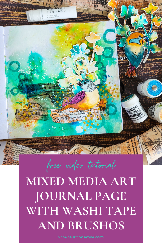 Willkommen zu meinem neusten Video! Es ist mal wieder eine Seite in meinem Lieblings-Art Journal vom Action. Ich verwende natürlich gleich mal meine neuen selbstgemachten Washi Tapes (aus meinem letzten Video) zusammen mit transparentem Gesso und Brusho Pulvern (Alternative: Lindy’s Magicals, Nuvo Shimmer Powders). Meine Hauptmotive sind einige Blätter, die ich mit unserer Sketchy Leaves 4 stencil Schablone gestaltet habe und ein Vogelstempel aus meinem Textured Birds Stempelset.