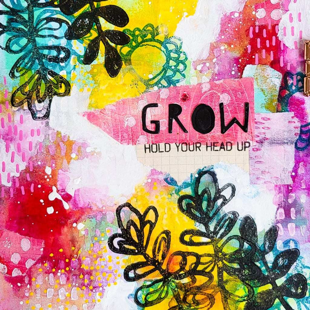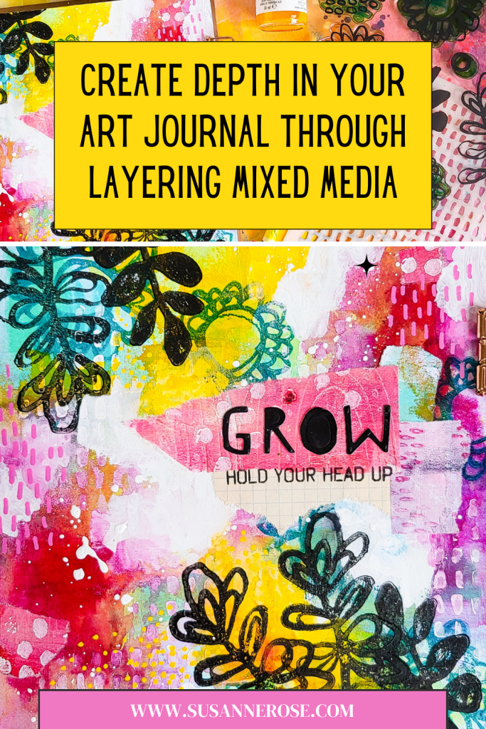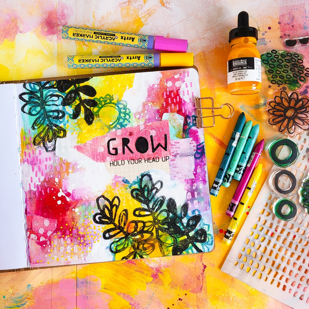 Hi everybody! I’m sharing an abstract mixed media art journal tutorial today and I am diving into transparent layering with different mediuma. Layers with texture and colours create depth in your abstract work. It makes your pieces interesting and the process is so enjoyable. For my spread I am using handmade collage papers, acrylic inks, paint pens, Neocolors, a stencil and stamps from Pencil Marks 7.