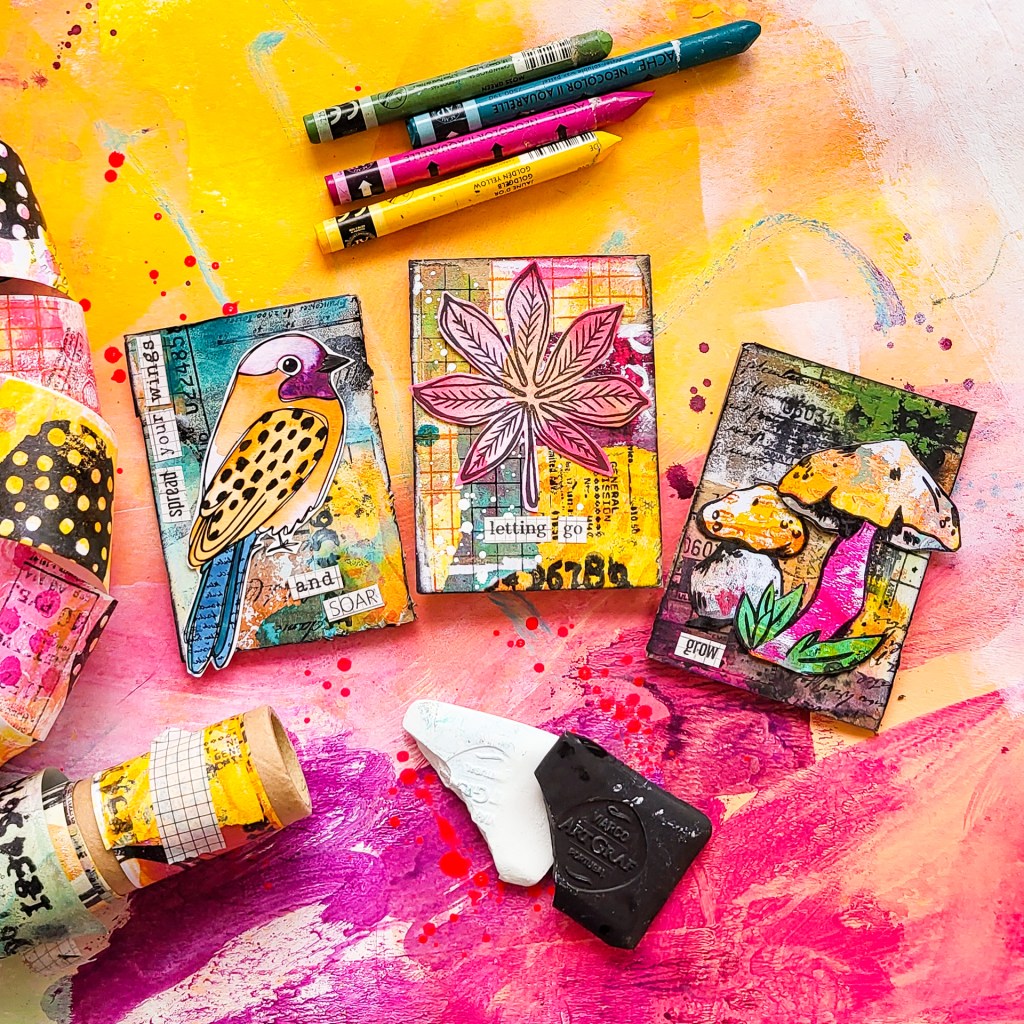 Hi everybody! I’m sharing an ATC trio today using cardboard and my handmade Washi Tape together with Neocolor II and some focal images from our Collage Leaves 2, Textured Birds 2 and Inky Mushrooms stamp sets. I have a video tutorial for you, I will also link up the DIY Washi tape tutorial at the end of this post.