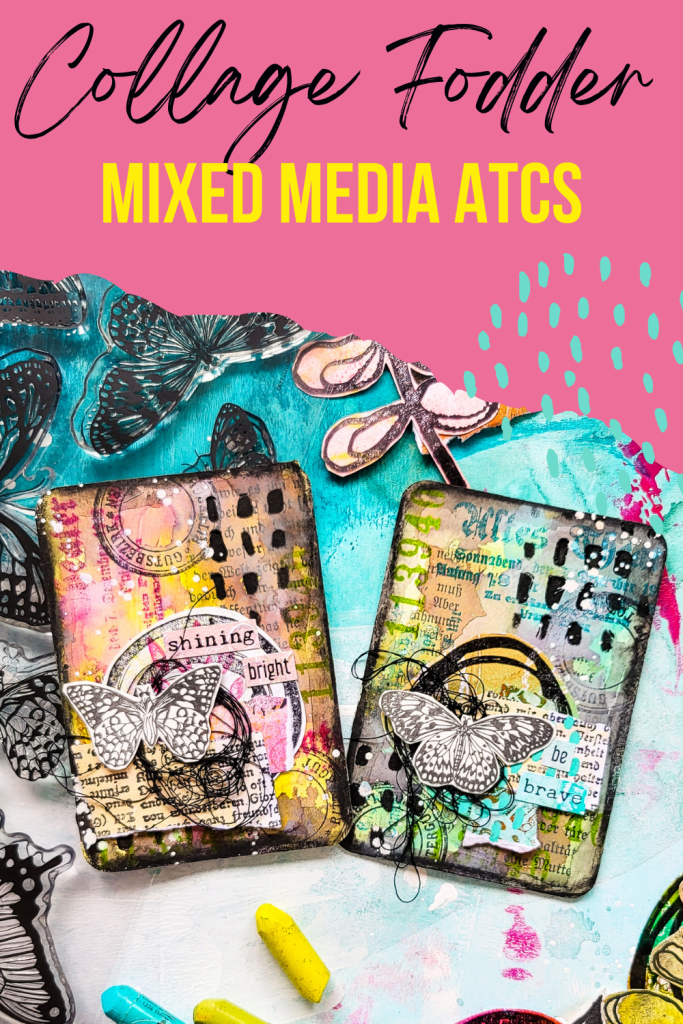 Willkommen zu meinem neusten Video! Heute verwende ich zwei meiner Collage Fodder Embellishments vom letzten Samstag und verziere damit zwei Mixed Media Artist Trading Cards. Für die Hintergründe verwende ich Collage, Neocolor II Kreiden, Distress Oxide Sprays und Schablonentextur.