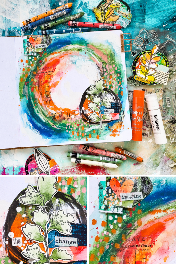 Hi there, Susanne here with a new mixed media art journal page in my Action art journal using a background collage made with my handmade washi tapes together with Neocolors and gouache sticks. As my focal images I am using my collage fodder embellishments I shared in one of my recent videos. This one features a stamp from our Doodle Flowers stamp set.