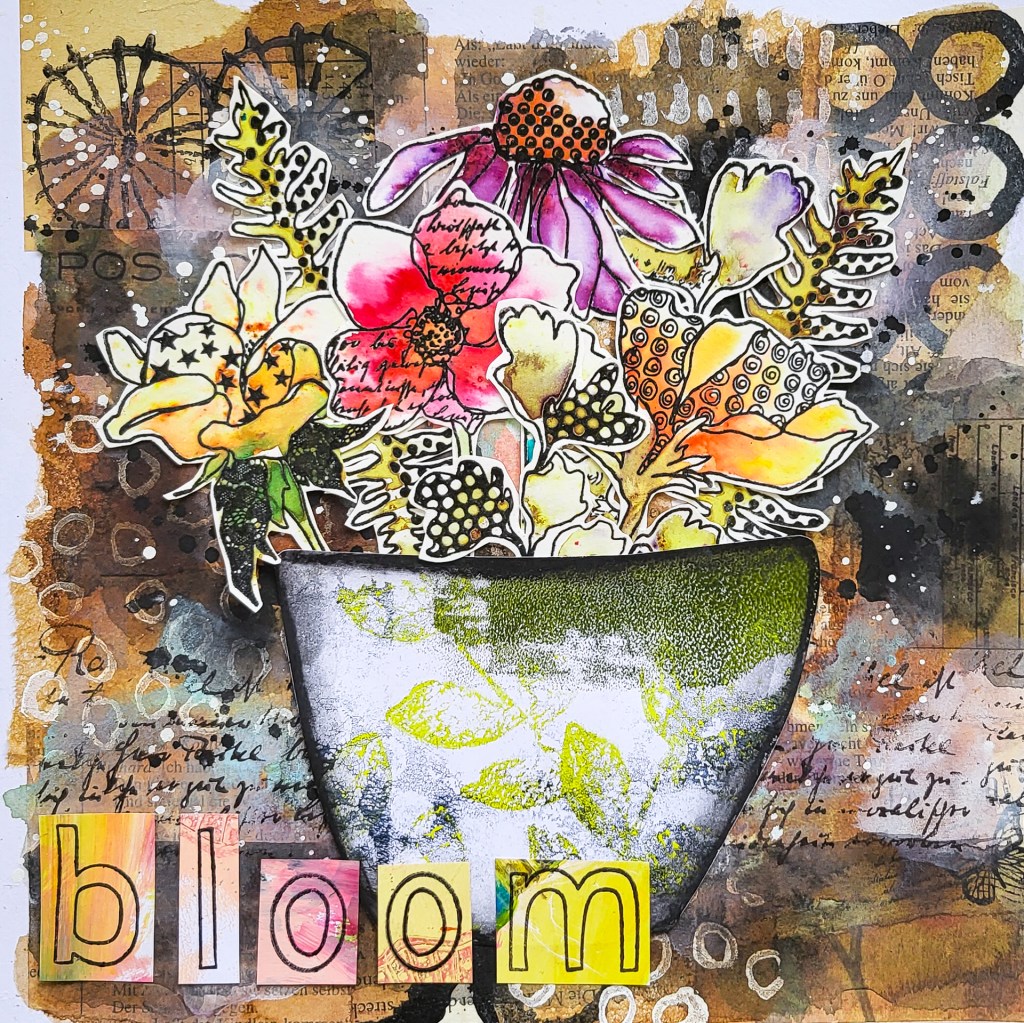 Hi there, Susanne here with a new mixed media art journal page in my Action art journal playing with collage, different inks, such as acrylic and Distress Oxide sprays and flower stamps from my new Doodle Flowers stamp set. The title is made with our A to Z stamp set.