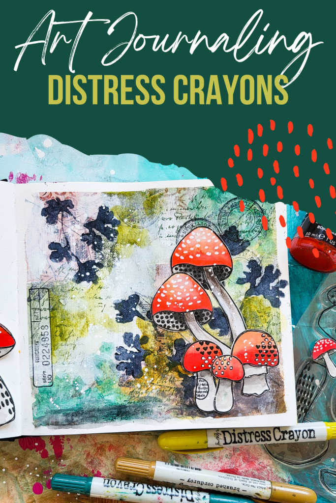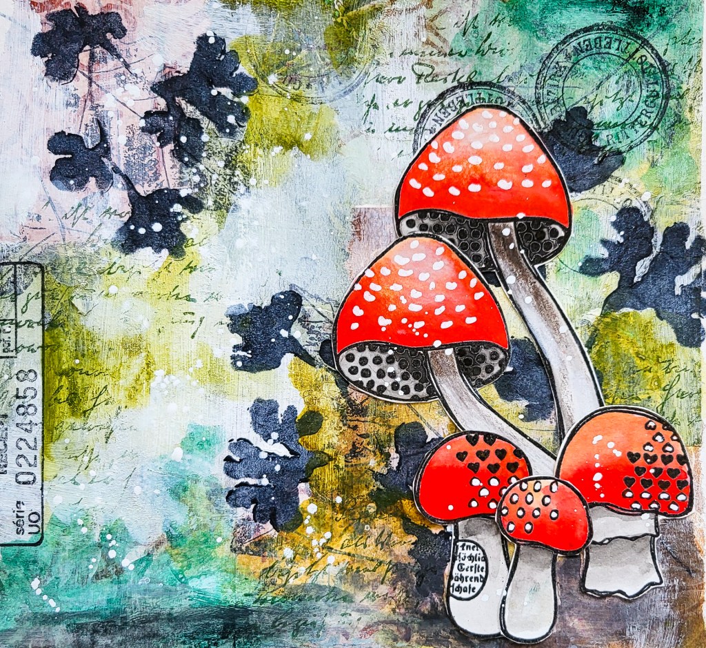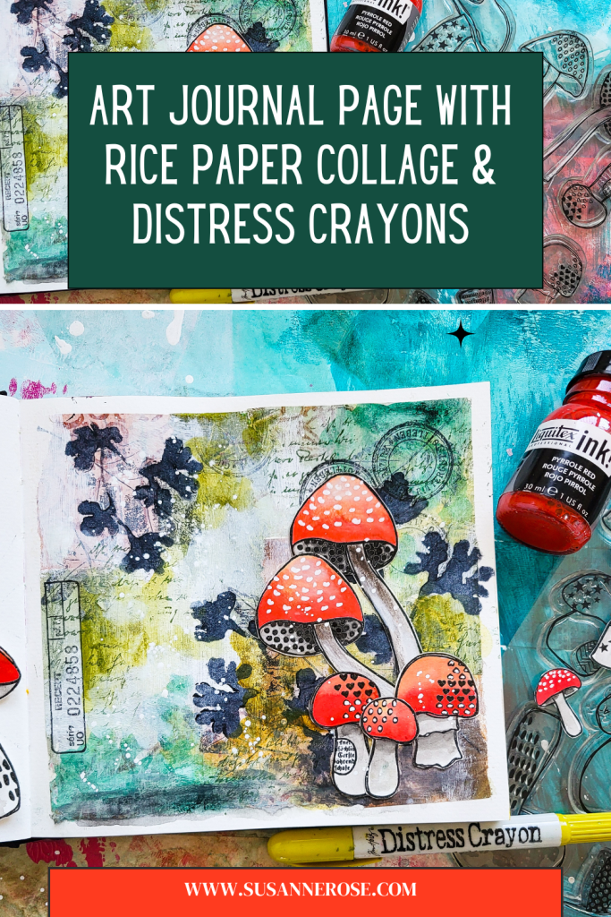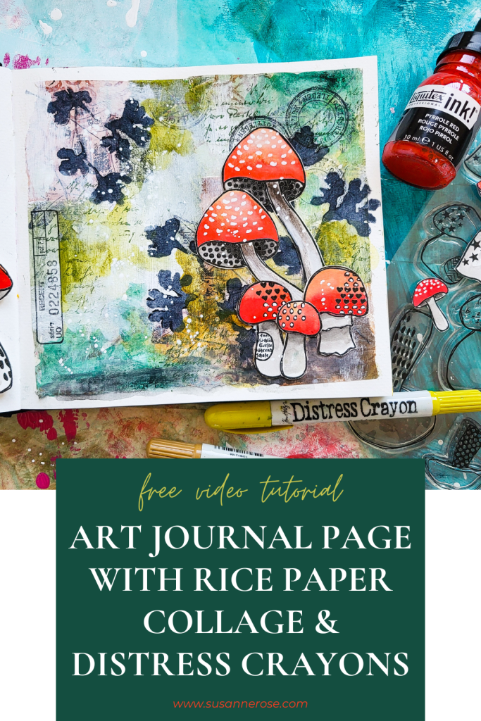 Willkommen zu meinem neusten Video! Heute gestalte ich wieder eine herbstliche Seite im Art Journal. Ich starte mit einer Collage aus bedruckten Reispapieren und bringe Farbe mit Distress Crayons ins Spiel. Für mehr Textur im Hintergrund verwende ich meine Autumn Leaves, Mix It Up 5 and Mix It Up 6 Stempelsets. Ich gestalte eine Waldszene mit Fliegenpilzen, die ich mit Stempeln aus meinem Textured Mushroom 2 Stempelset kreiert habe.