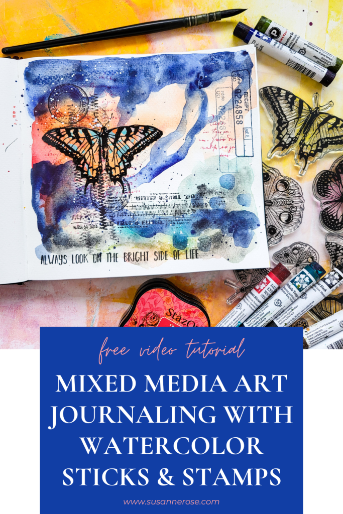 Hi everybody! I’m sharing an art journaling tutorial. Today I’m playing with my Daniel Smith watercolor sticks and a few stamps from Mix It Up 5 and Mix It Up 6. As my focal image I used an image from our Butterflies and Moths stamp set. I really love playing intuitively and abstract with watercolors. You don’t need these sticks to play along, usual watercolors will work just as fine.