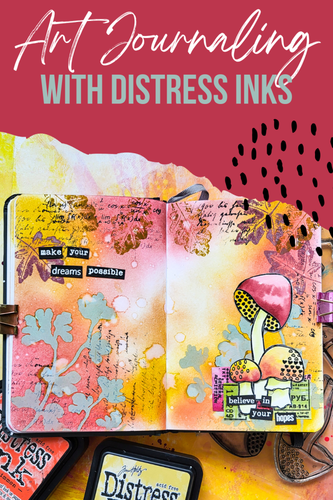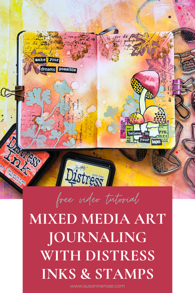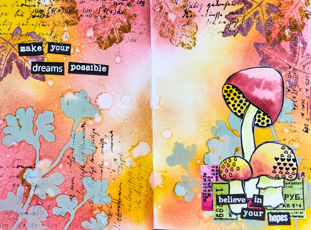 Hi there, Susanne here with a new mixed media art journal page using Distress Inks and Oxides for the background together with my Sketchy Leaves 4 stencil. I am creating an autumnal forest scene with the Textured Mushroom 2 stamps as focal images. I colored the mushrooms with Distress Inks, too. For even more texture and interest I also used images form my Autumn Leaves, Mix It Up 4 and Mix It Up 6 stamp sets. I used Fossilized Amber, Scattered Straw, Aged Mahagony and Worn Lipstick from the Distress Inks and Peeled Paint from the Distress Oxides.