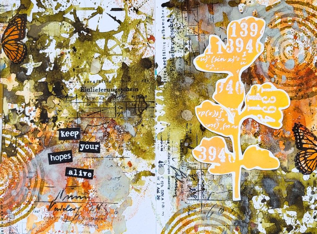 Hi there, Susanne here with a new mixed media art journal page using Distress Inks together with stencils and a mini gel plate to create texture and depth. I am also working with stamps from my Mix It Up 4 and Mix It Up 6 stamp set. As my focal image I used a leaf that I’ve made with my Sketchy Leaves 5 stencil, Distress Oxide in Wild Honey and some embossed textures