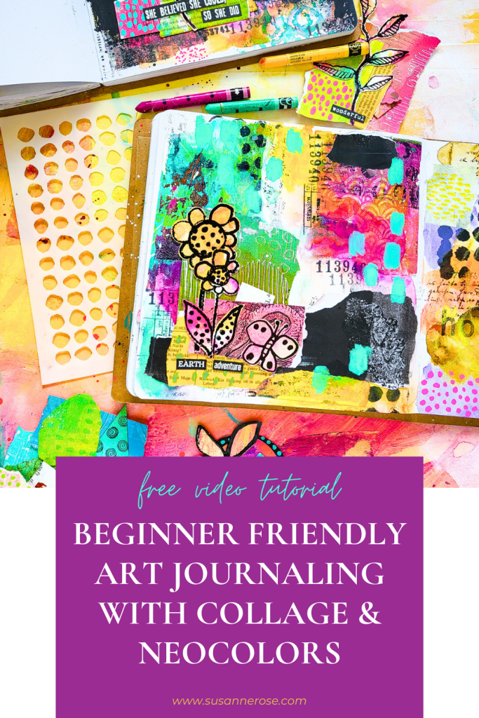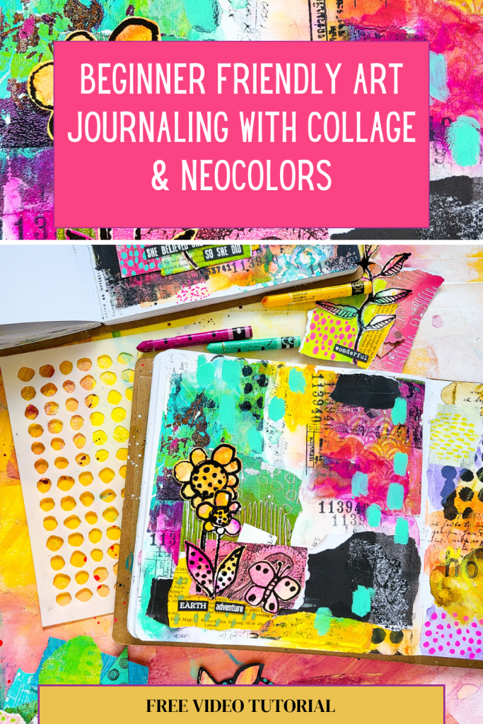 Hi everybody! Today I am sharing an art journaling tutorial in my Action journal. I am creating a mixed media collage with Neocolors and some stamps. For my focal image I used stamps from my Pencil Marks 4 and Pencil Marks 8 stamp set. There is a tutorial available for YouTube members on how I made it.