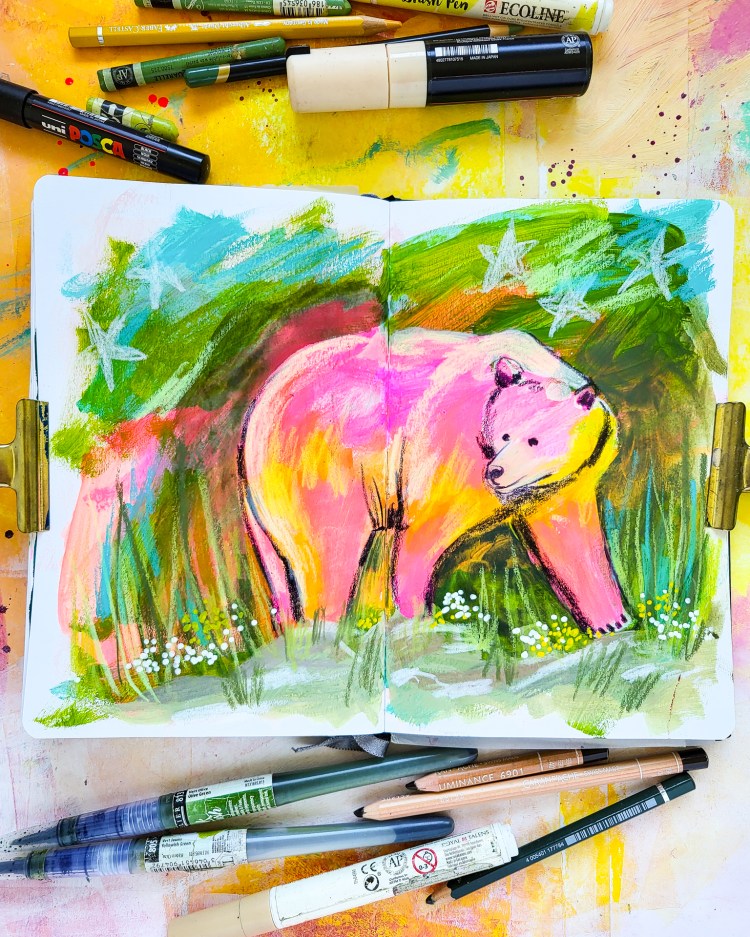 On the next three images I worked over a prepped background, using acrylic gouache! I really like the results! I feel it gives the drawings more looseness (if this is a word).