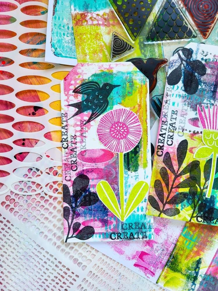 Hi everybody! I’m sharing a video tutorial today creating two lovely graphical tags using my gel plate, textured plates, made with my new stencils, and my new stamp set Carved Collection 6. It’s 10% off until tomorrow over at rubberdance.com