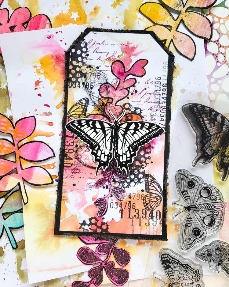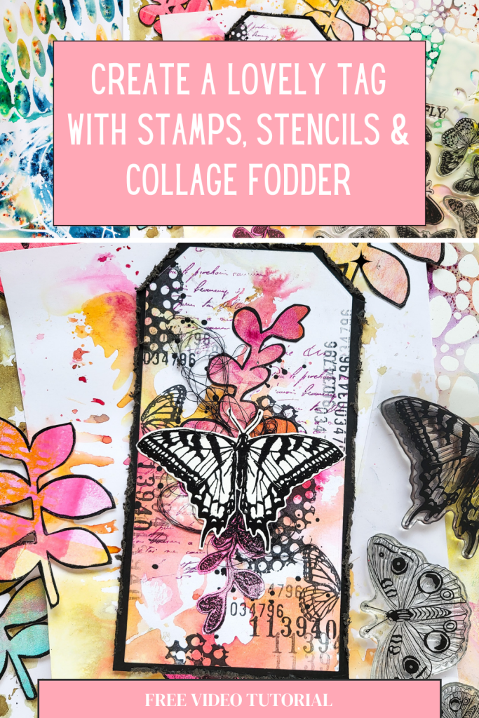 Hi everybody! I’m sharing a video tutorial today creating a lovely mixed media tag on a stencil background using stamps from Butterflies & Moths, Mix It Up 6 & Mix It Up7 together with collage fodder.